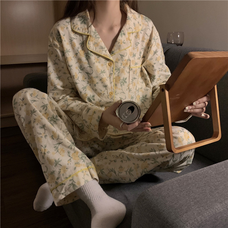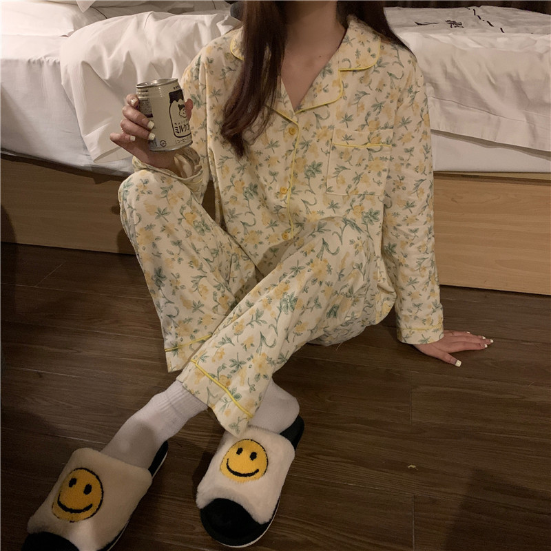 South Korean ins ~ gentle moments pyjamas women turn over the flap yellow Crushed Flowers Long Sleeves Long Pants Mill Wool cotton Home Clothing