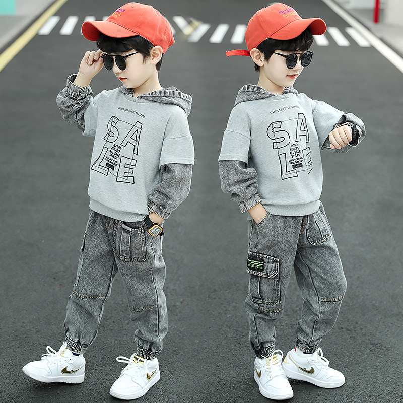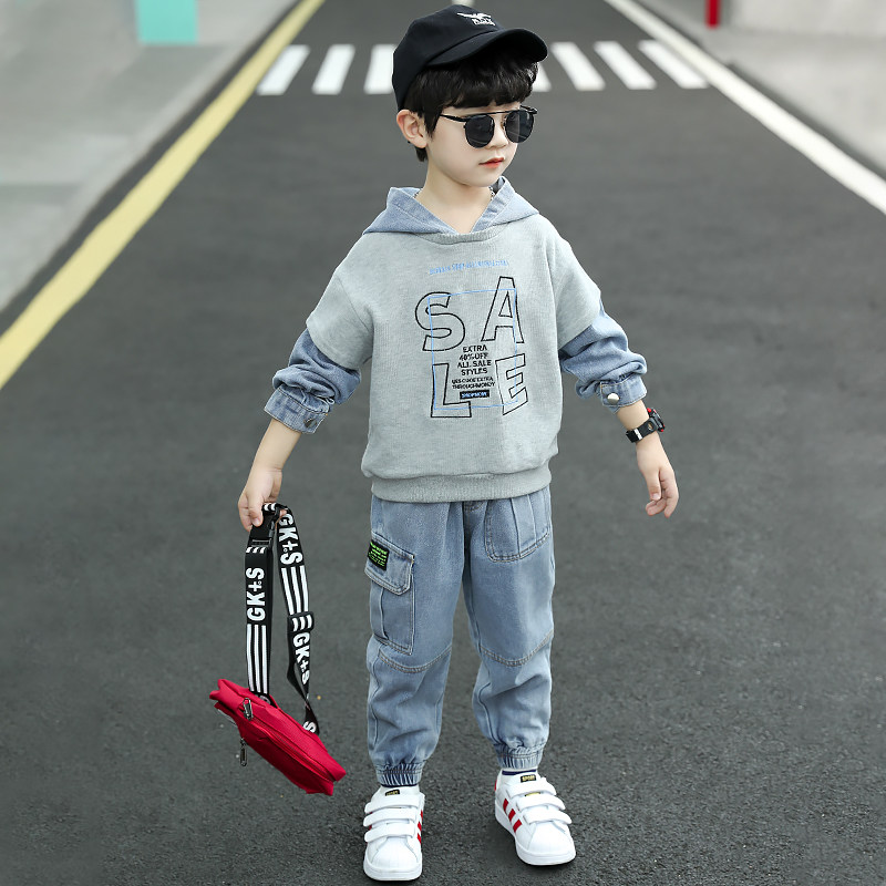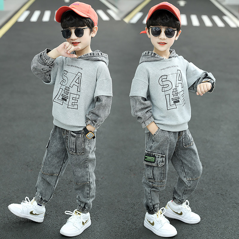 Children's spring and autumn suits new boy's Western style autumn clothes fake two-piece sweater middle-aged children's Korean version of denim two-piece tide