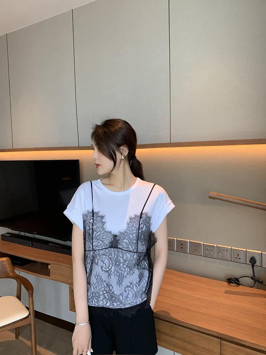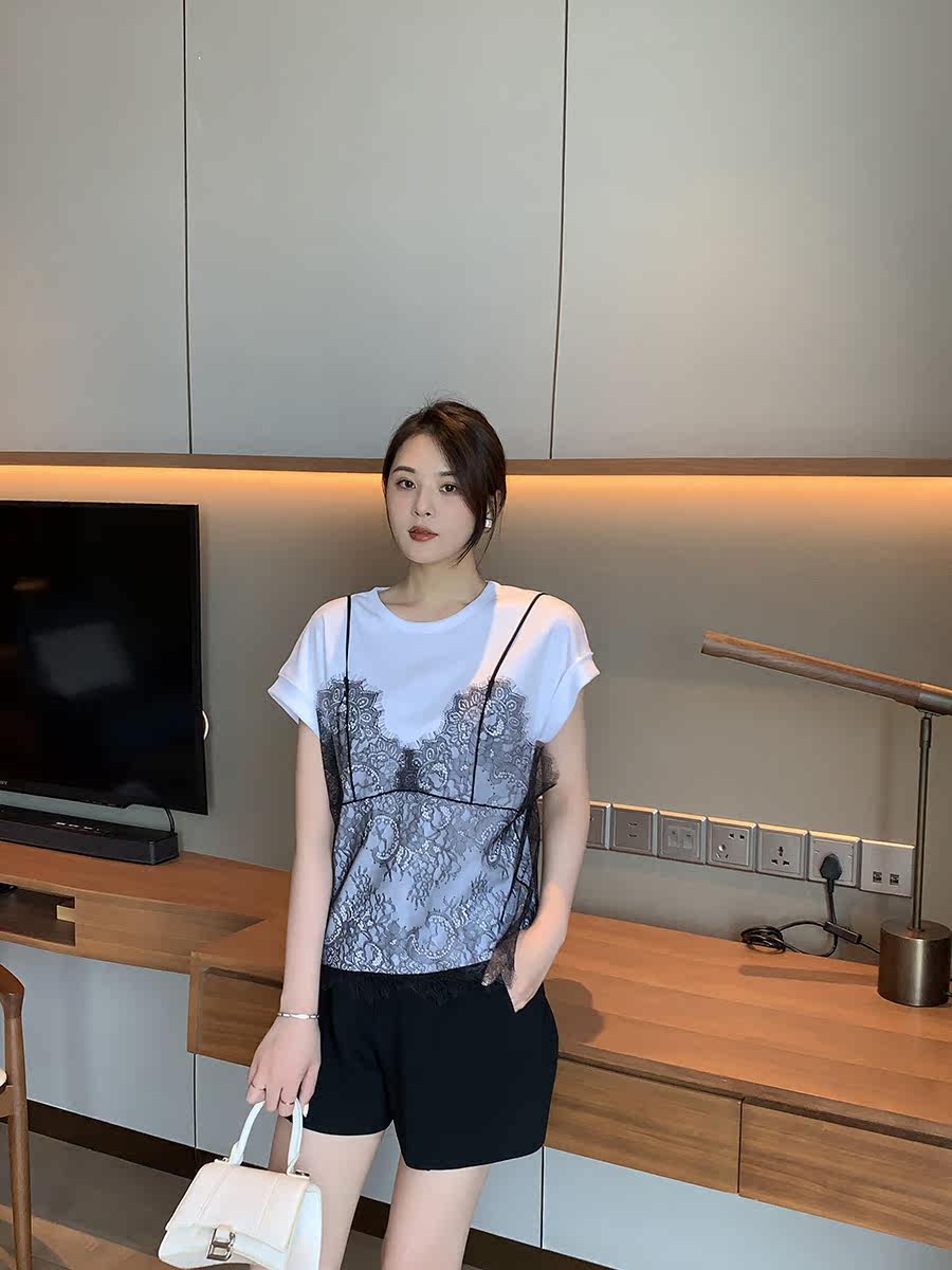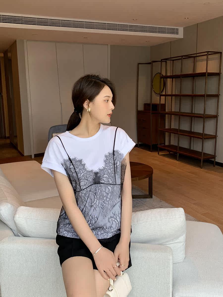 Sister K (lace beauty) liquid ammonia cotton fake two-piece lace suspenders all-match short-sleeved T-shirt for women
