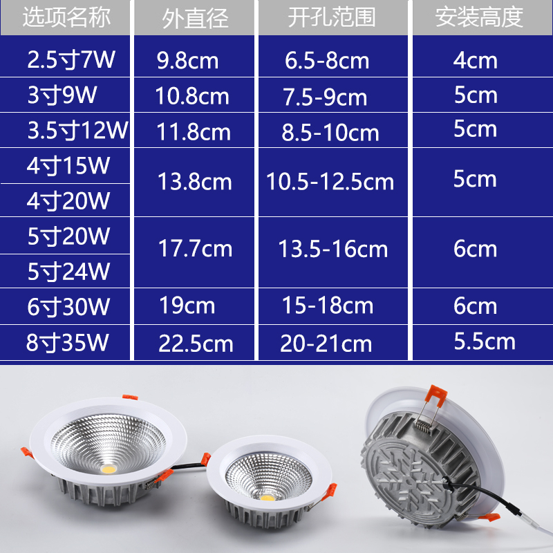 (COB section) 2 5 inch 7W positive white light (COB section) 2 5 inch 7W neutral light (COB section) 2 5 inch 7W warm yellow light (COB section) 3 inch 9W positive white light (C