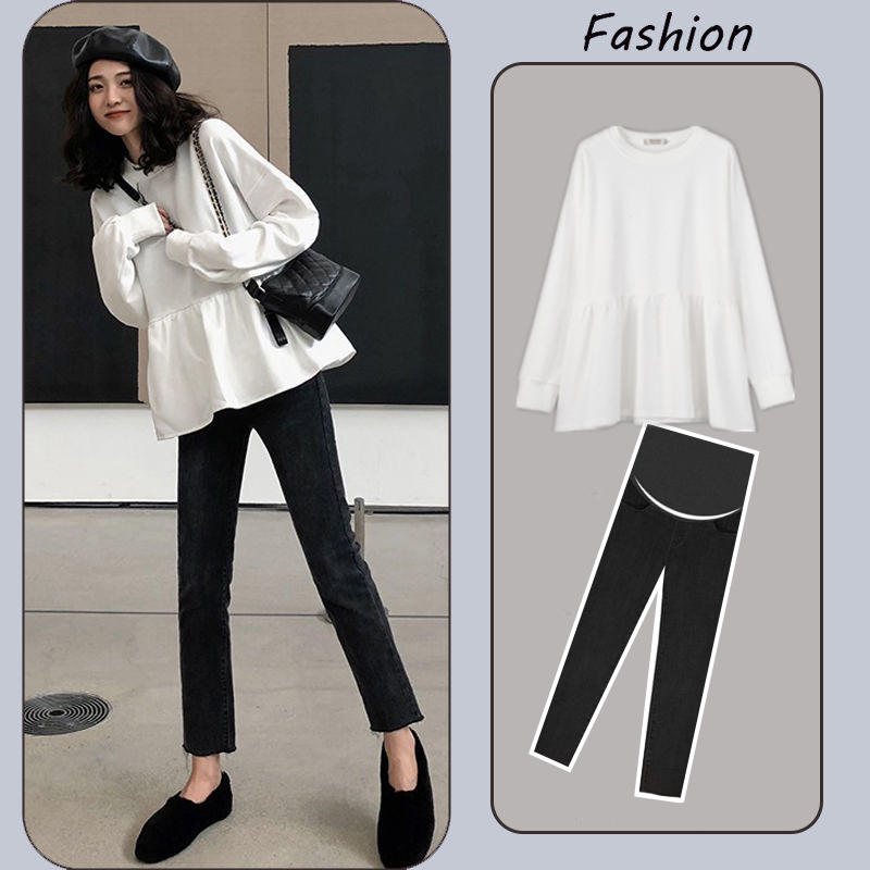 Pregnant women's autumn suits fashion net red spring and autumn Korean version long-sleeved doll shirt top loose sweater autumn two-piece set
