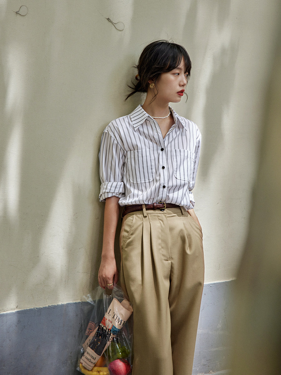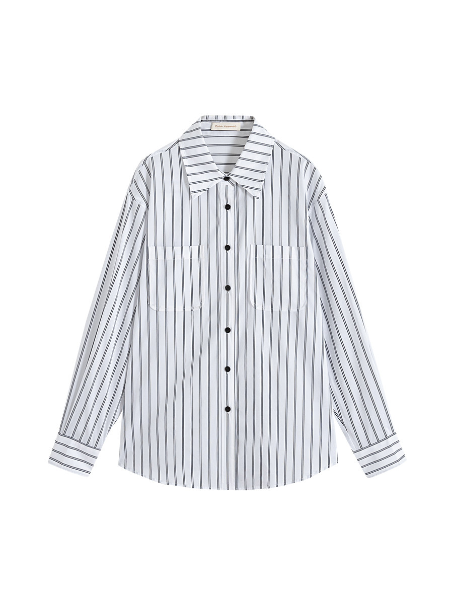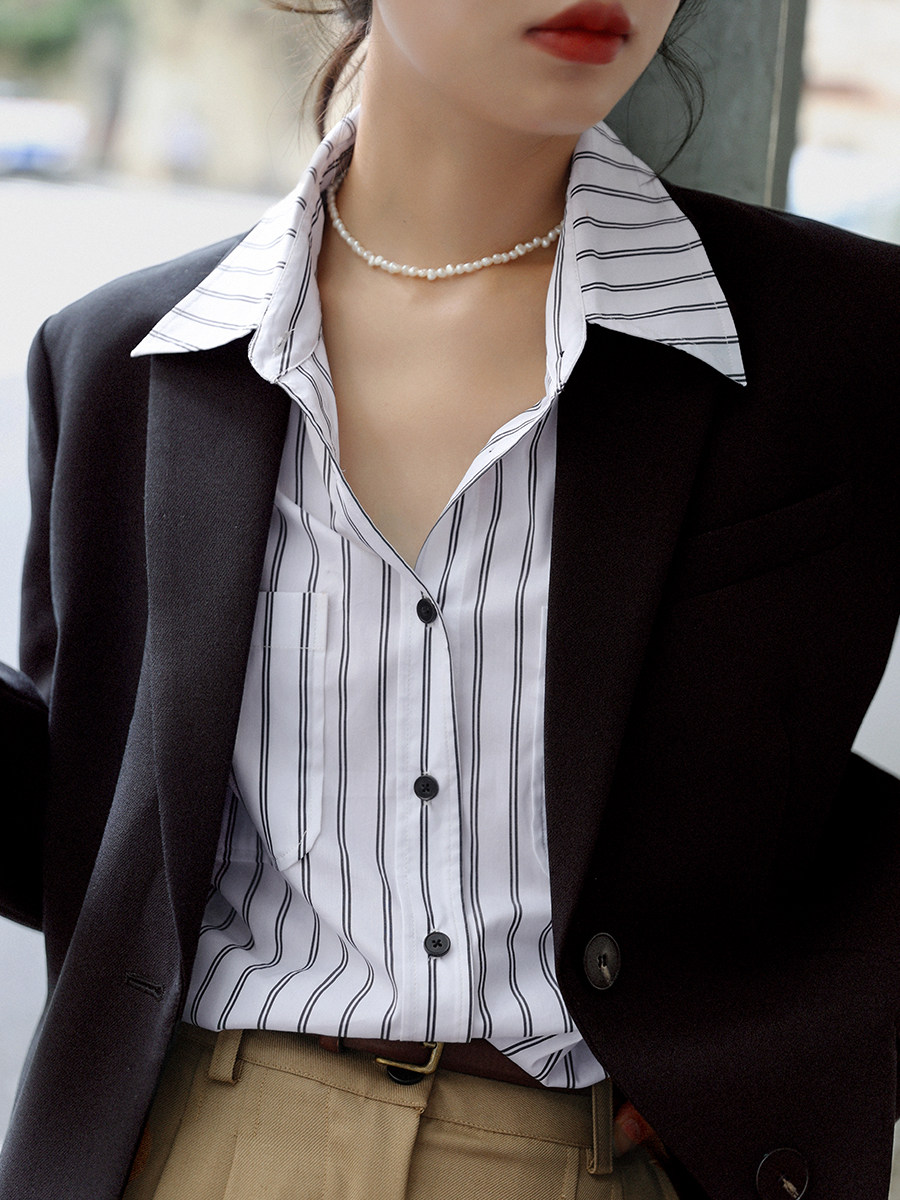 The beautiful emperor French lazy style black and white striped long-sleeved shirt women's summer new loose all-match shirt