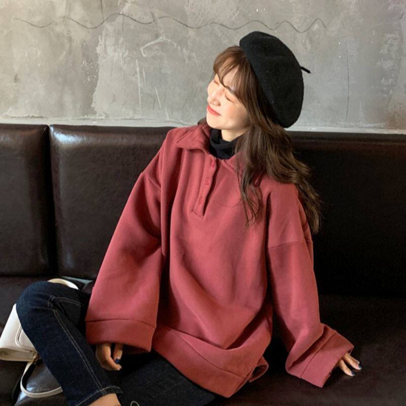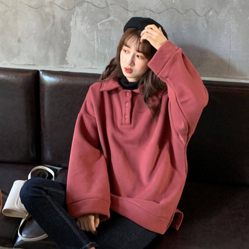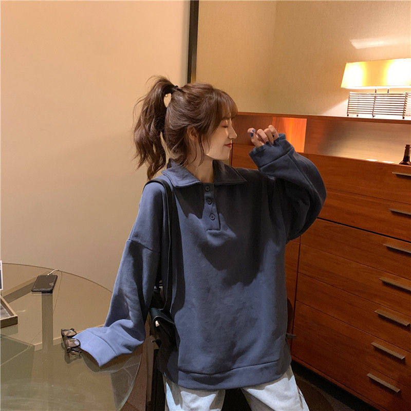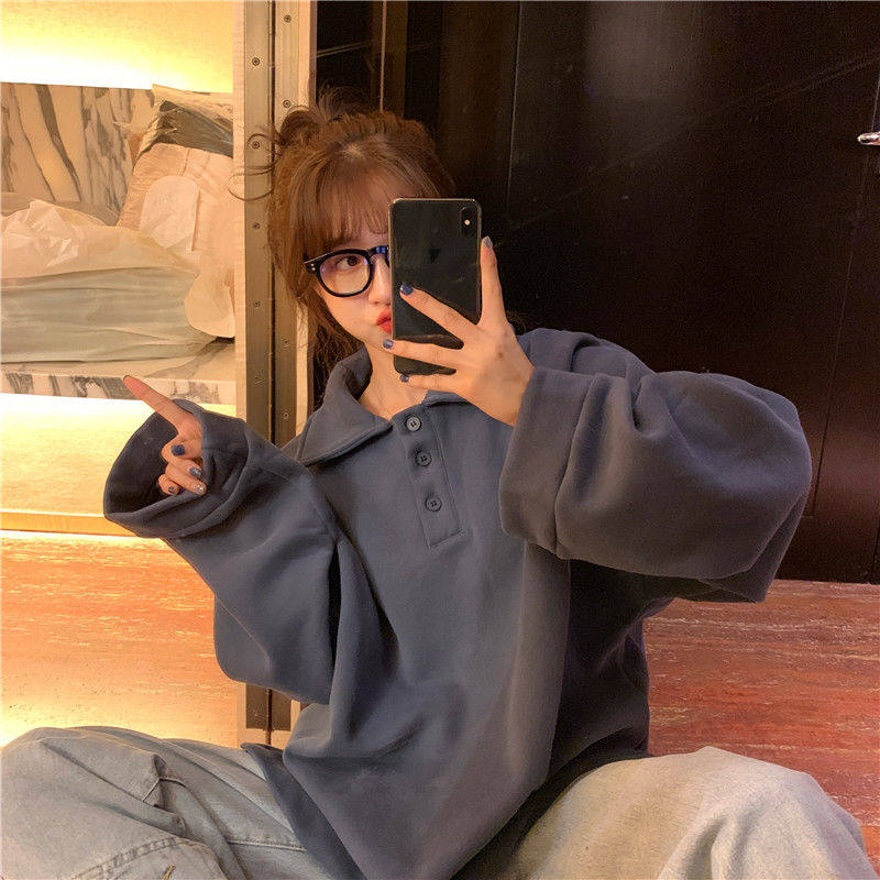 Lake because of the blue sweatshirt women loose plus fleece thickened super fire Cec long sleeves women polo collar ins tops women bf lazy
