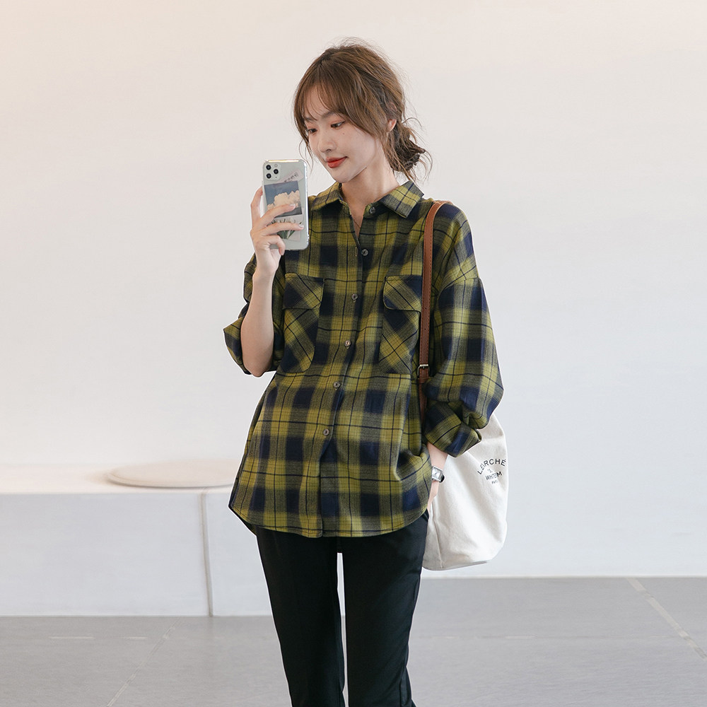 Moka Yellow Blue Bump Jersey ~ Pregnant Woman Internet Red Plaid Blouse Autumn New Foreign Pie Out Breastfeeding Boomer Shirt