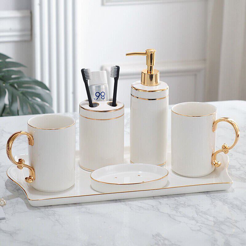 White gold handle bathroom six-piece set (with tray) white gold handle five-piece bathroom set white gold edge bathroom six-piece set (with tray) white gold handle five-piece bathroom soap dish 1 gold handle mouthwash cup 1 gold edge