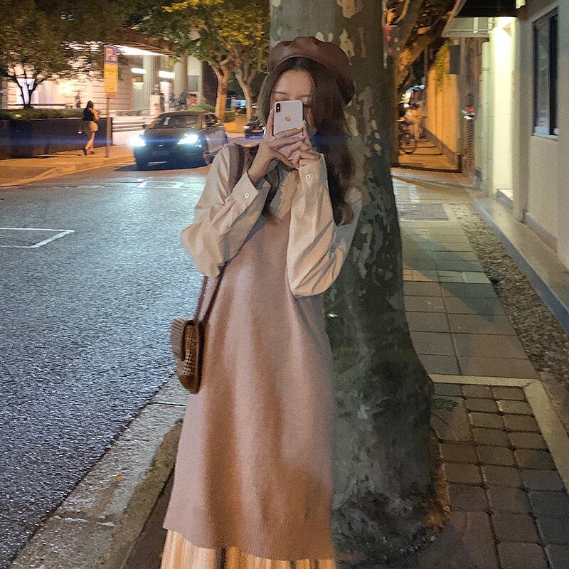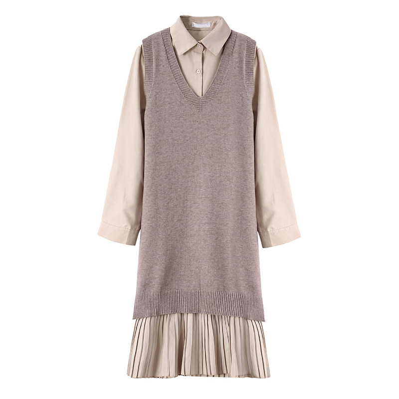 Pregnant women spring new large size fashion suit fat MM spring shirt dress foreign style knitted vest two-piece set