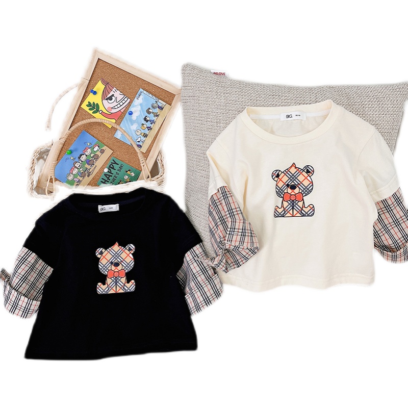 Autumn New Arrival Boys Bear Print Plaid Sleeves Sweater Spring and Autumn Children's Casual Knit Casual Tops