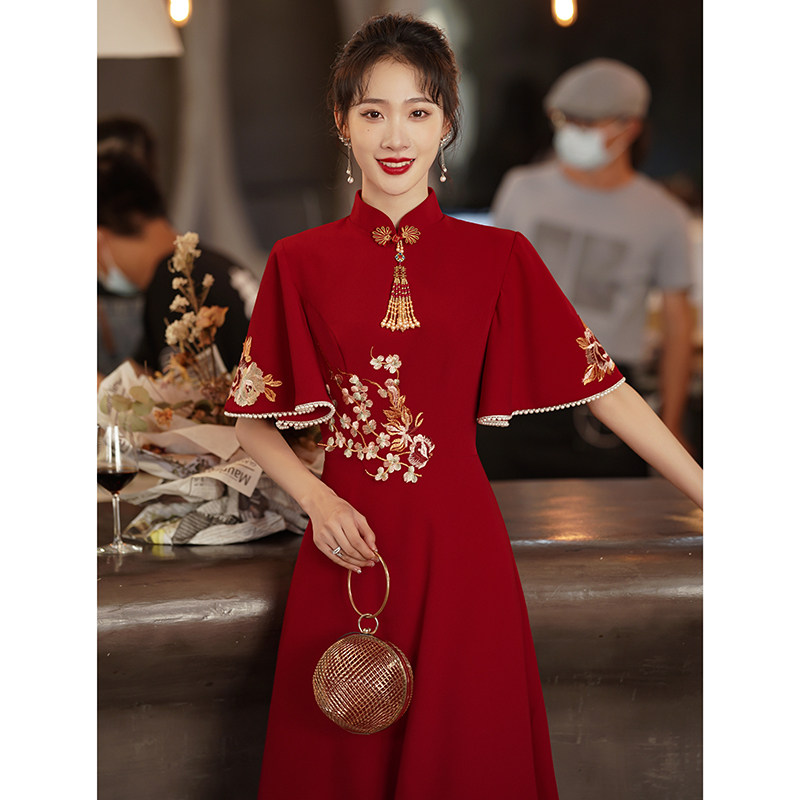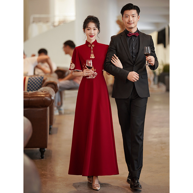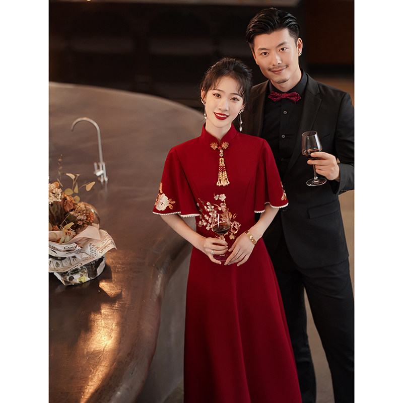 Cheongsam toast bride 2021 new autumn slim Chinese long wedding dress dress female wine red spring and autumn