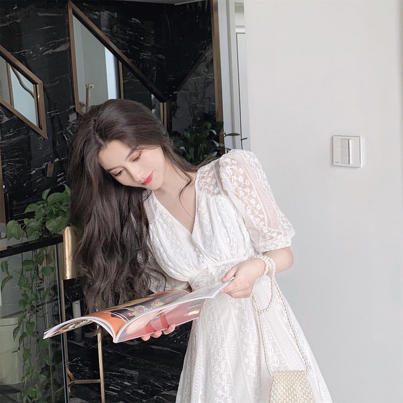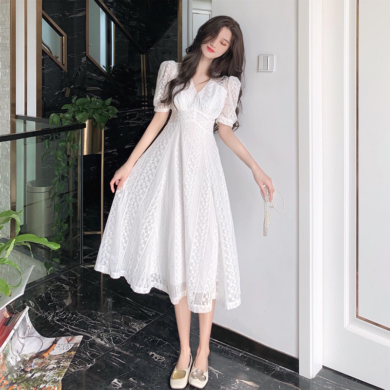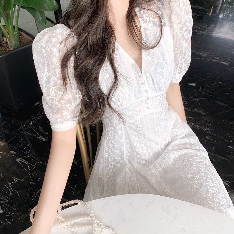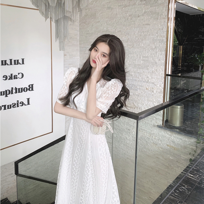 MOLEITAU fashion sweet lace white chiffon dress 2022 summer waist waist temperament French platycodon skirt