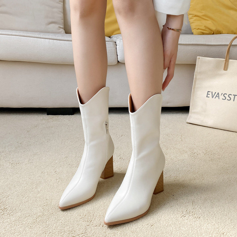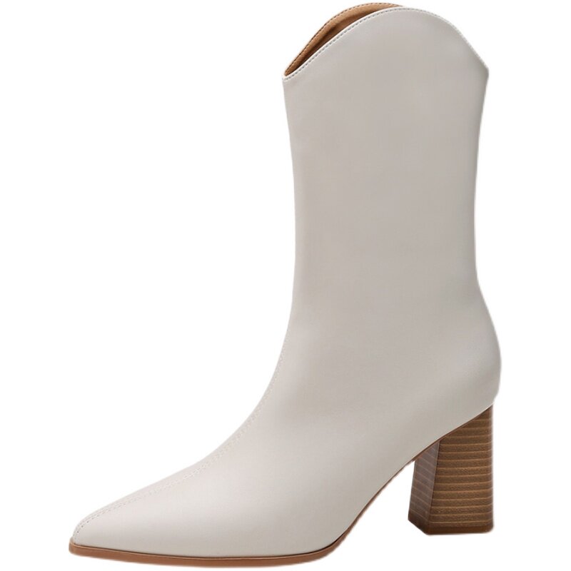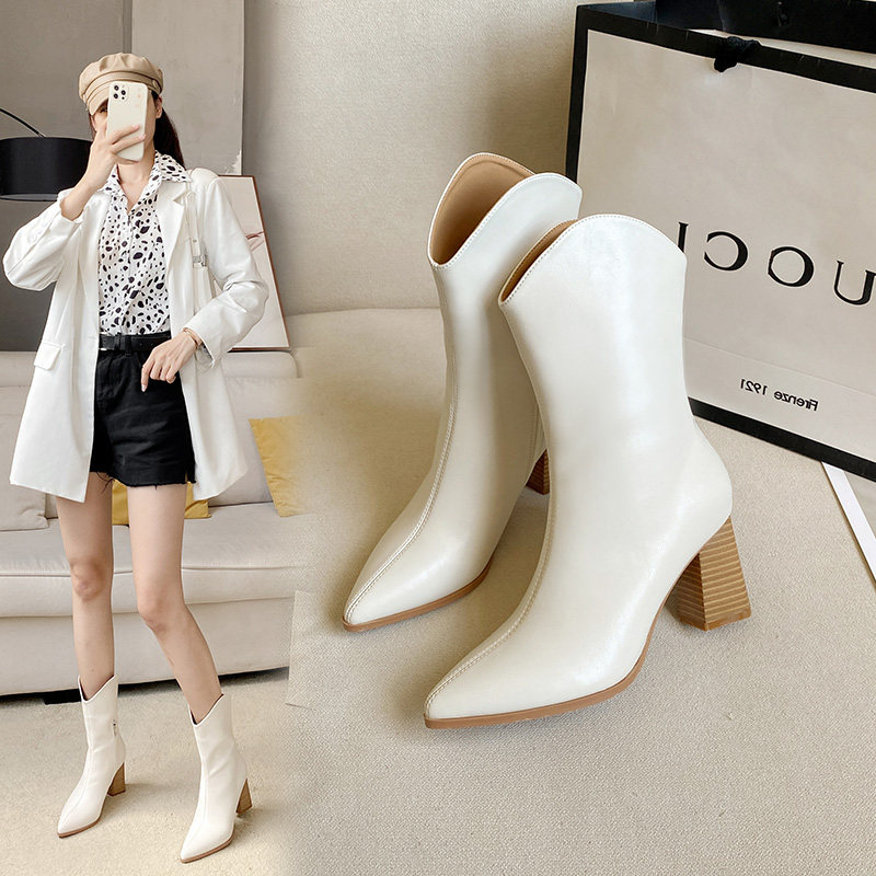 Hong Kong leather thick-heeled short boots women's ins tide 2023 autumn and winter plus velvet all-match pointed toe high-heeled British knight boots
