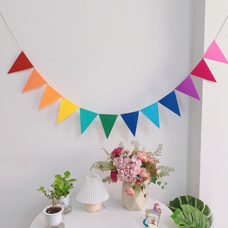 Nonwoven colored triangle children's birthday party arranged with colorful background drawn flower decoration children's room arrangement