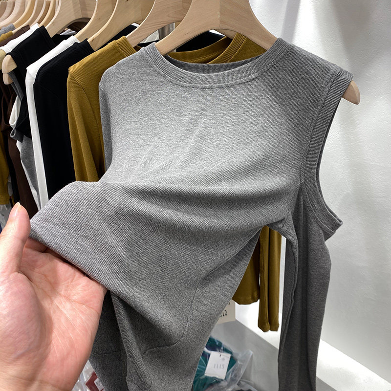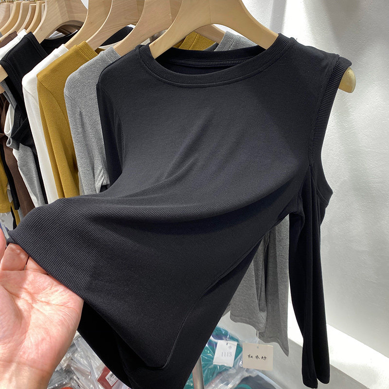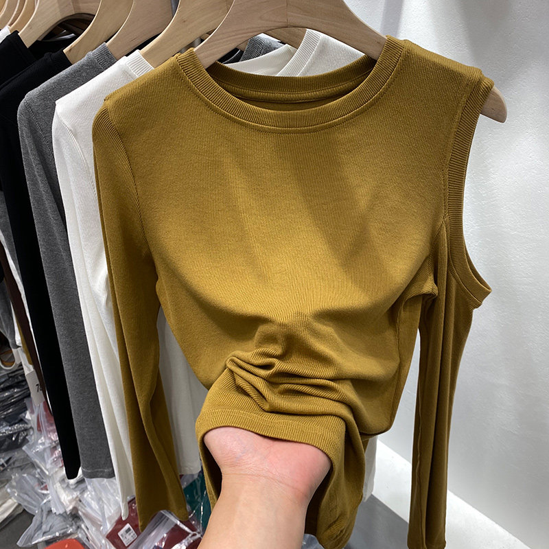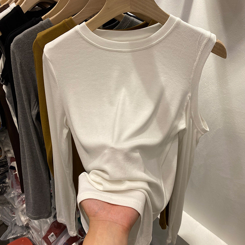 Eurcargo Design Sense Asymmetrical Dew Shoulder Thread Long Sleeve T-shirt Woman 2021 Early autumn new foreign pie undershirt blouse