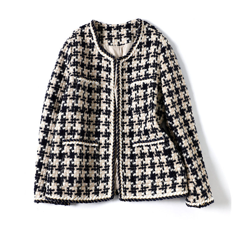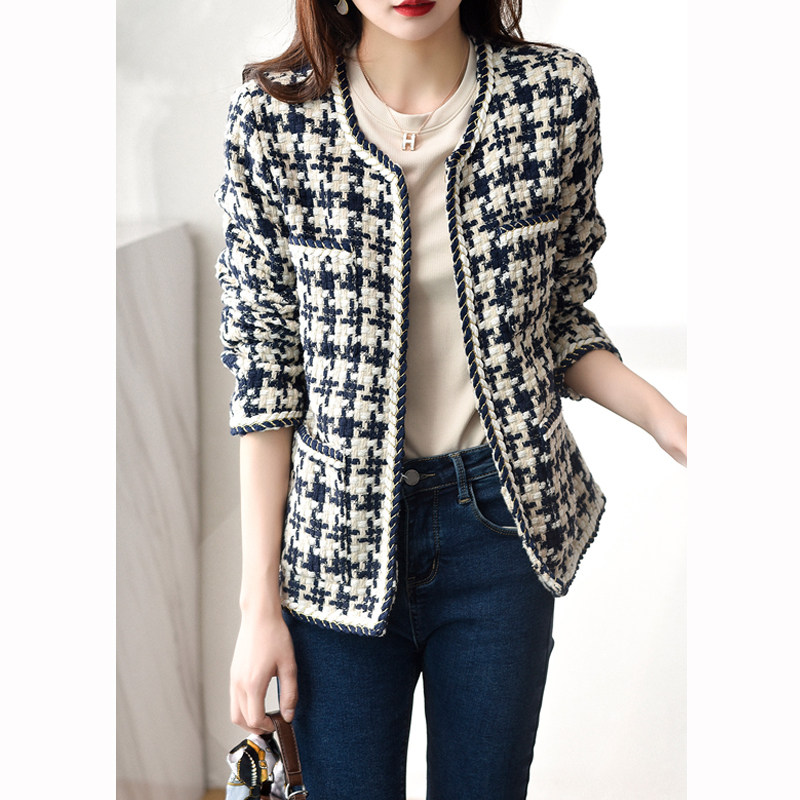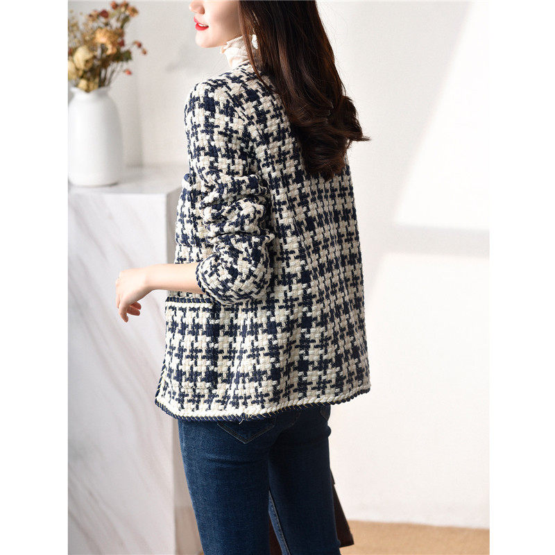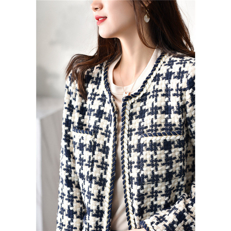 Day Faculty light extravaganza Classic small fragrant wind Short coat female coarse flowers Woven Tibetan Green Strips Wool Blend Blouse