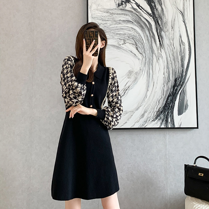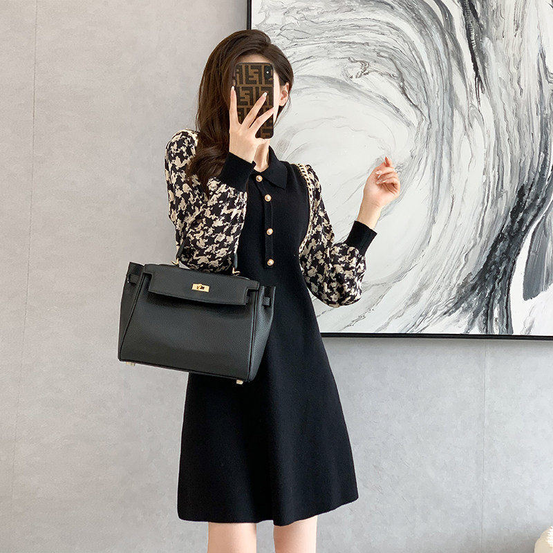 French knit dress women's 2021 autumn and winter retro small fragrance style stitching receiving waist slimming base temperament little black dress