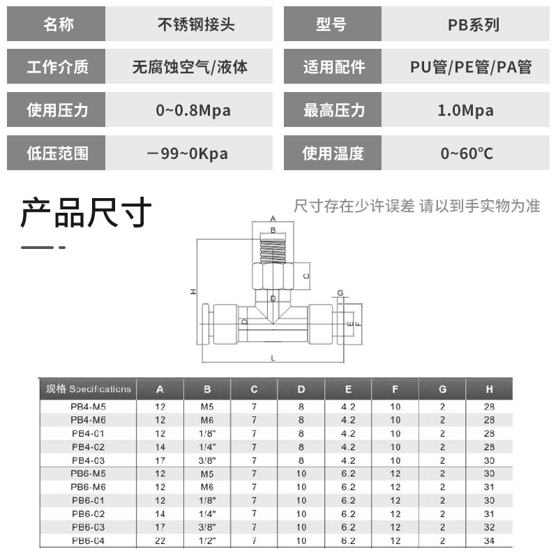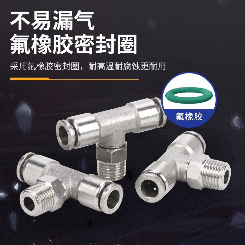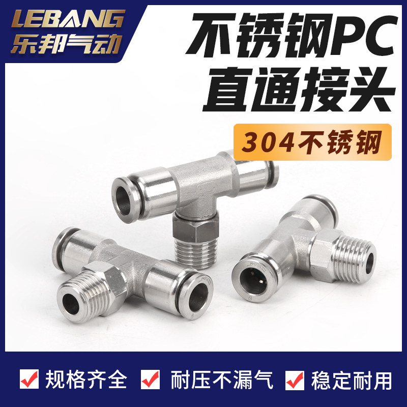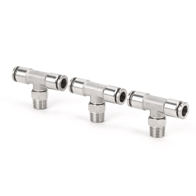 High temperature resistant high-pressure corrosion 304 stainless steel gas nozzle Quick insertion T type positive three-way external thread pneumatic joint PB8-02