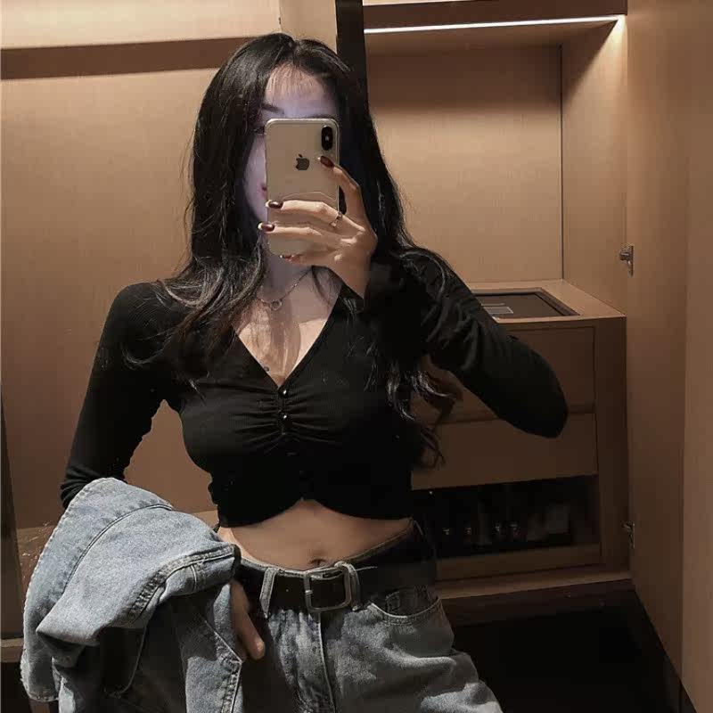 Vanya Black Black Down 2023 Spring and Autumn Sexy V - collar Short Waist Knitted T - shirt