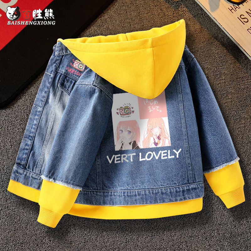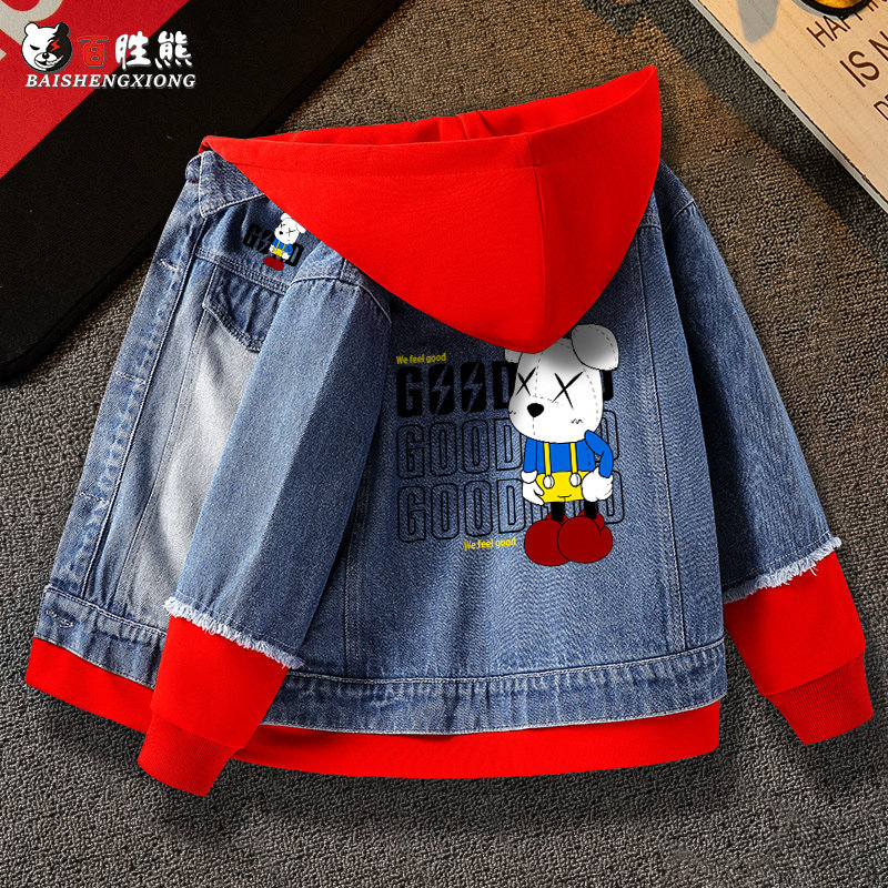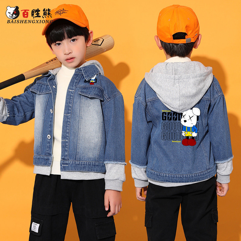 Boy's sweatshirt spring clothing pure cotton cardiovert jacket denim jacket big boy boy children not even cap fake two blouses spring and autumn