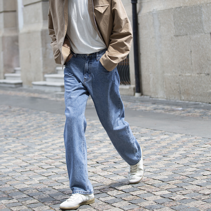 MOREFANS Blue Loose Straight Drum Jeans Washed long pants 100 hitch a new men's trend Korean version of the wind