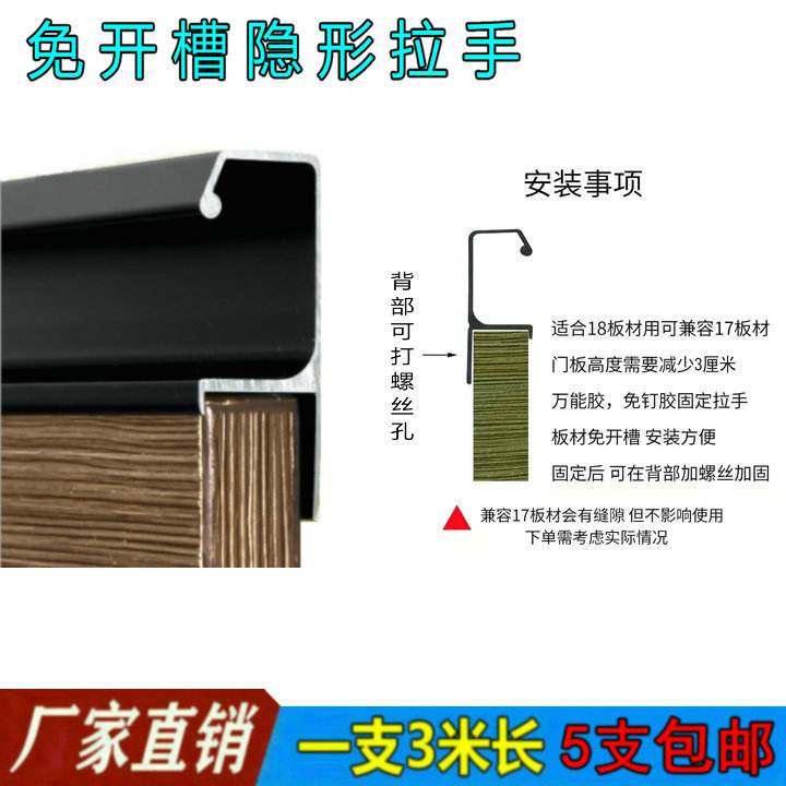 Type F Thickened Aluminum Alloy Free Slotting Overall Cabinet Handle Matt Black Invisible Handle Drawer Concealed hand cabinet door handle
