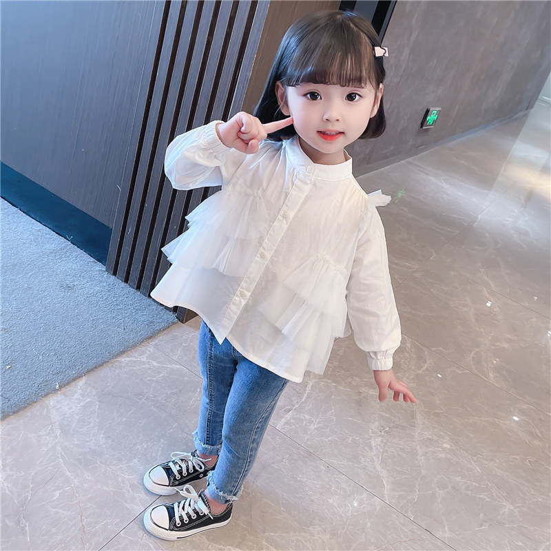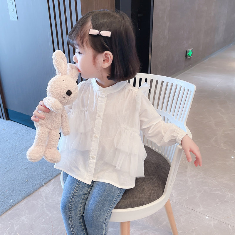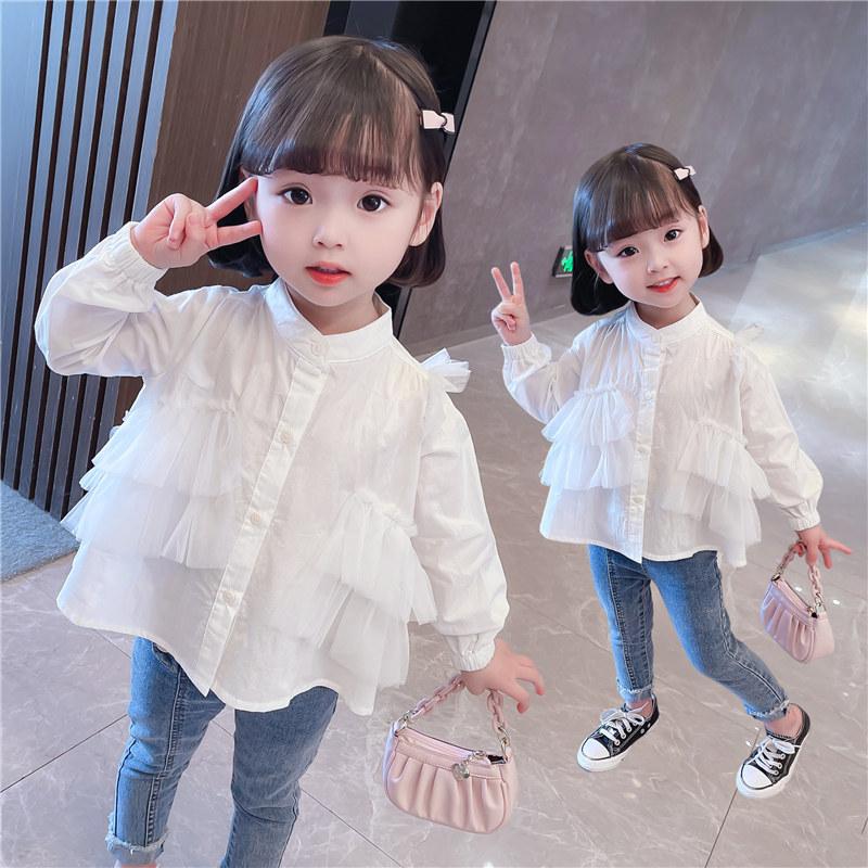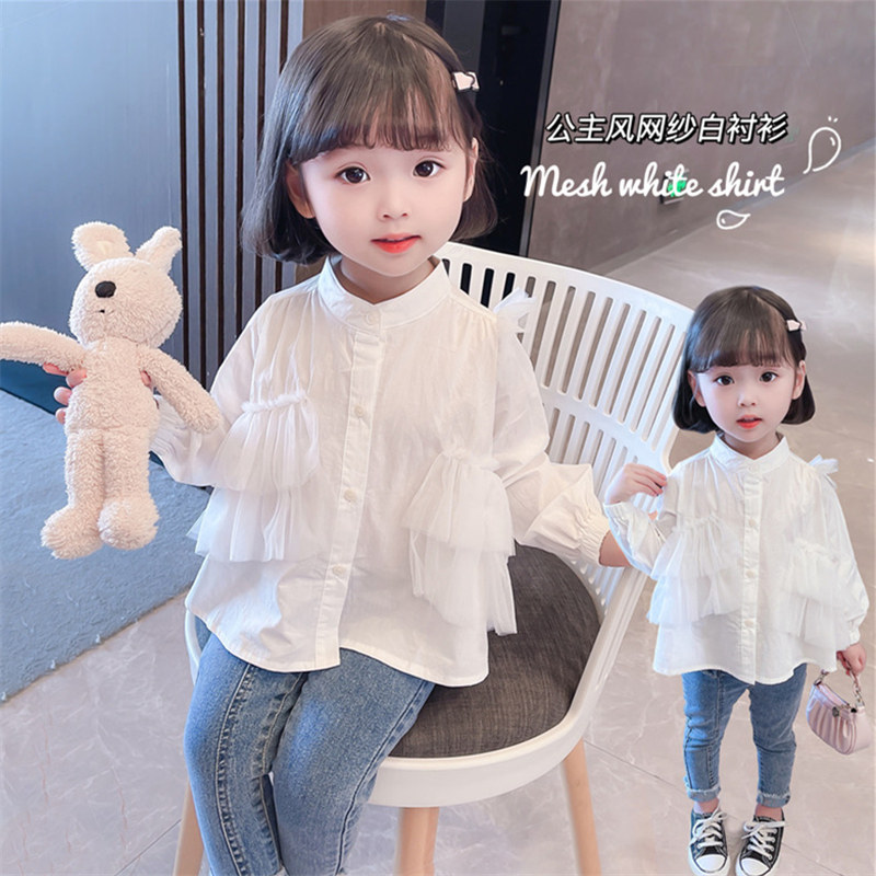 Girl White Shirt Spring Autumn Children Spring Dress Foreign Pie Mesh Yarn Splicing Female Baby Shirt Pure Cotton Boy Fashion Tide