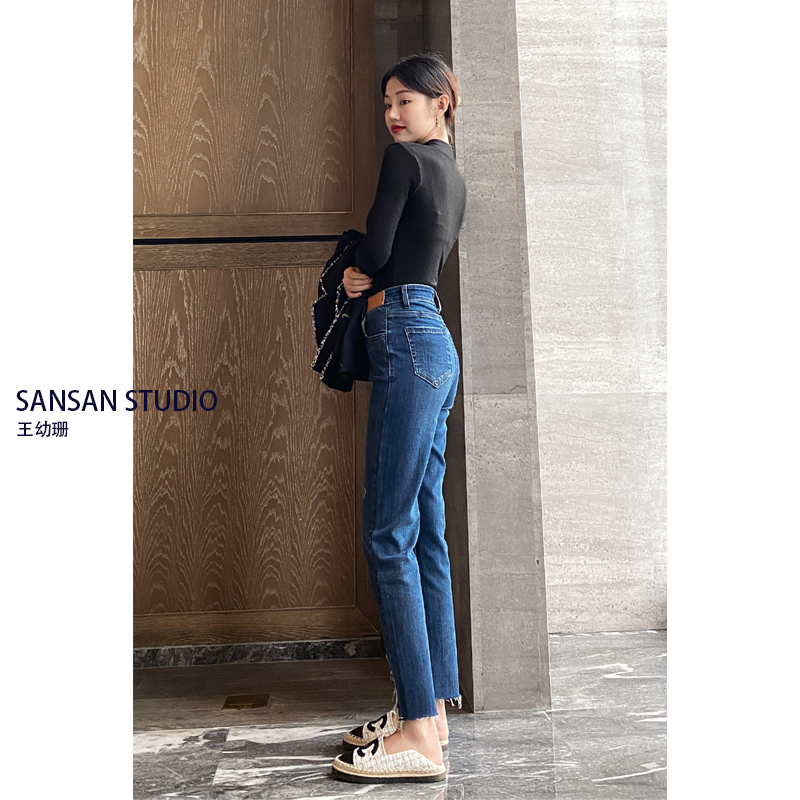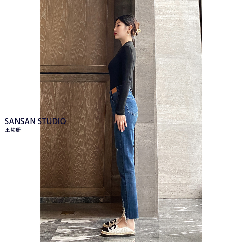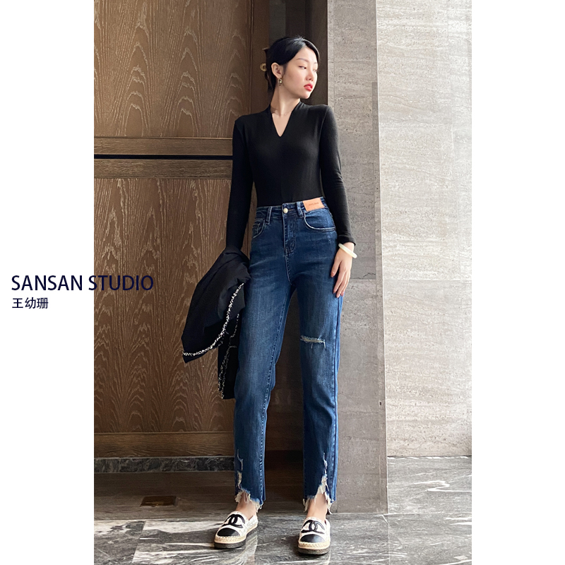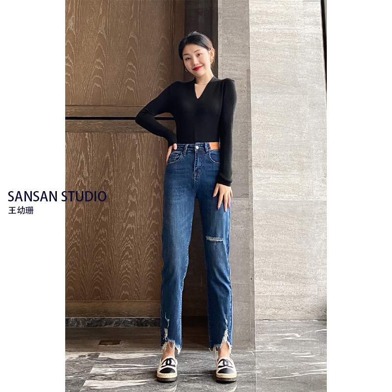 Wang Youshan ripped straight jeans women's high waist loose 2022 spring style slim fit and slim nine-point cigarette pipe pants
