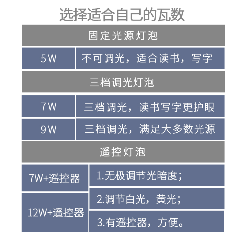 黑色(12W遥控款调光调色) 纯黑色(5W暖光LED) 灰色(7W三挡调光) 纯白色(5W暖光LED) 粉色(12W遥控