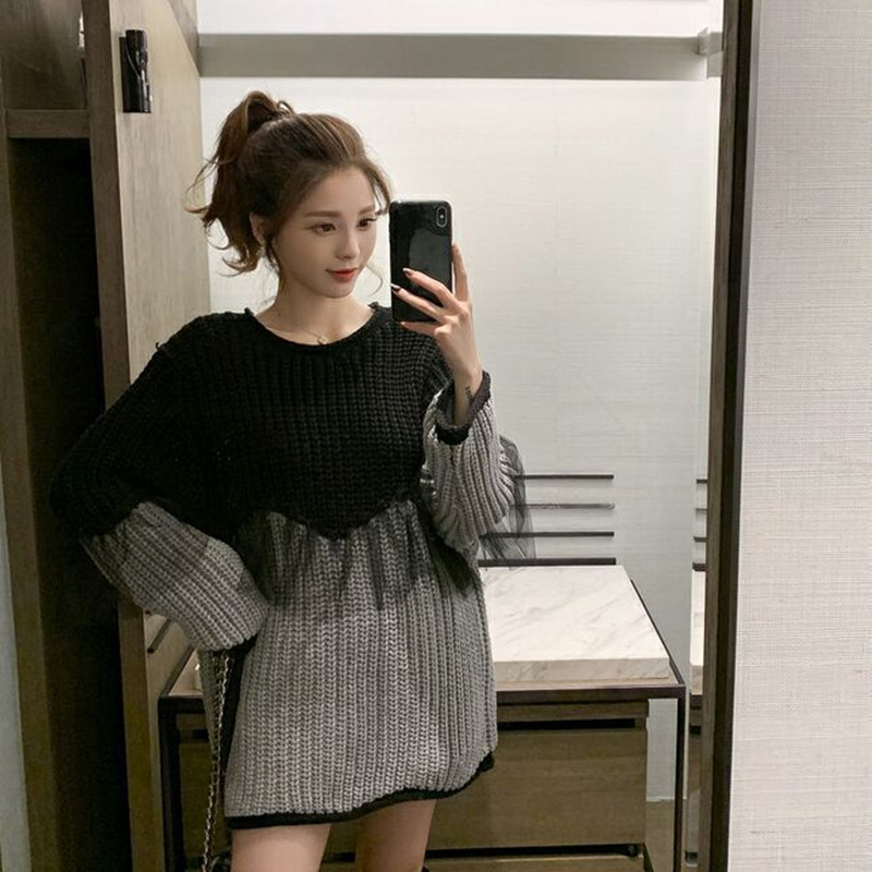 2021 Fall new lace splicing Lazy Wind Stitch Cardigan Woman Medium Long Version Bangs Color Sweater Design Sensation Blouse