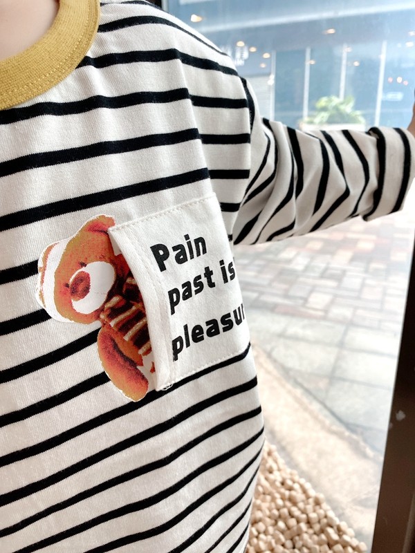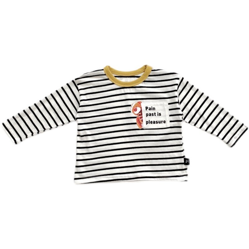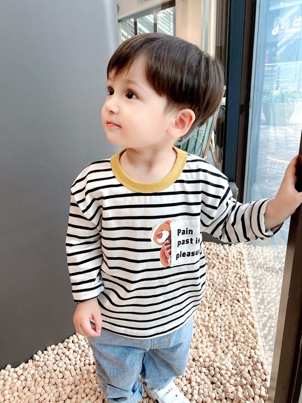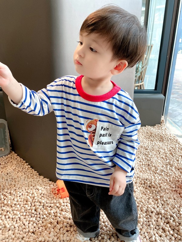 Pocket Cubs ~ Boy pure cotton striped Long sleeves T-shirt in children's spring autumn Coloured neckline blouses undershirt