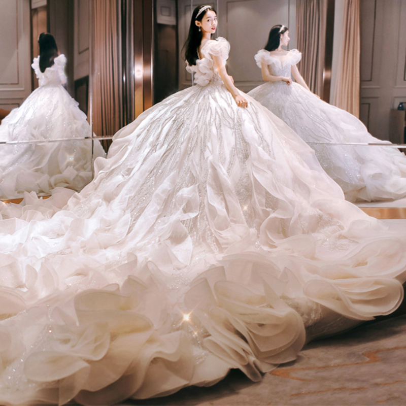One-shoulder French fugitive princess light wedding dress 2022 new bridal main yarn dress high-quality texture large size trailing tail