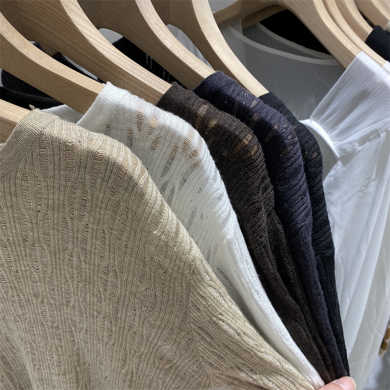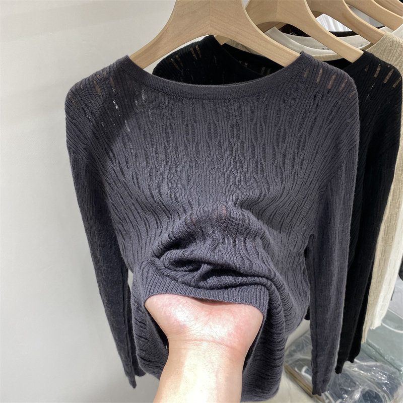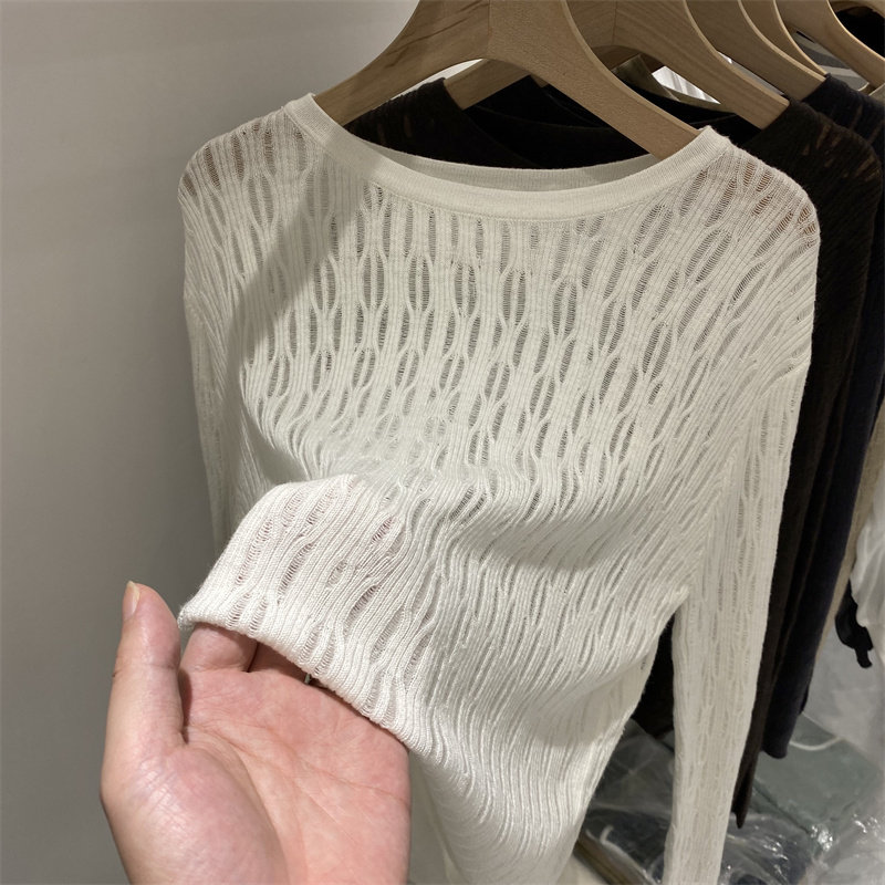 2021 Early autumn fitted new soft glutinous hollowed-out thin needle weaselwear woman long sleeve loose foreign pie 100 lap air conditioning hooded blouse