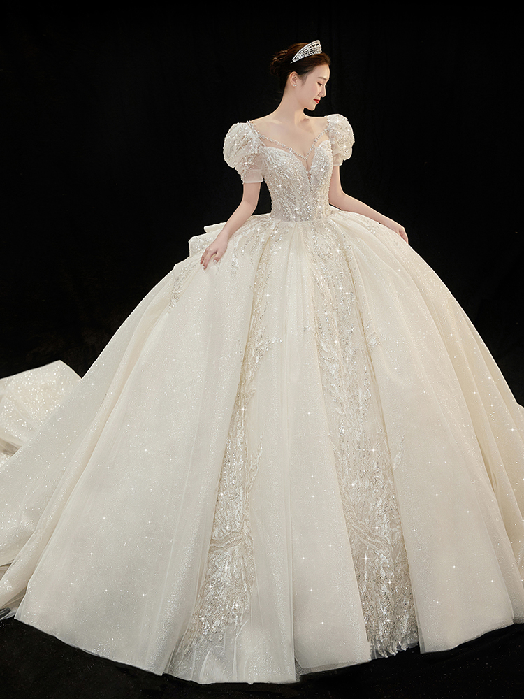 Wedding dress 2022 new summer bride one-shoulder French maternity main yarn luxury large tail palace wind puff sleeves