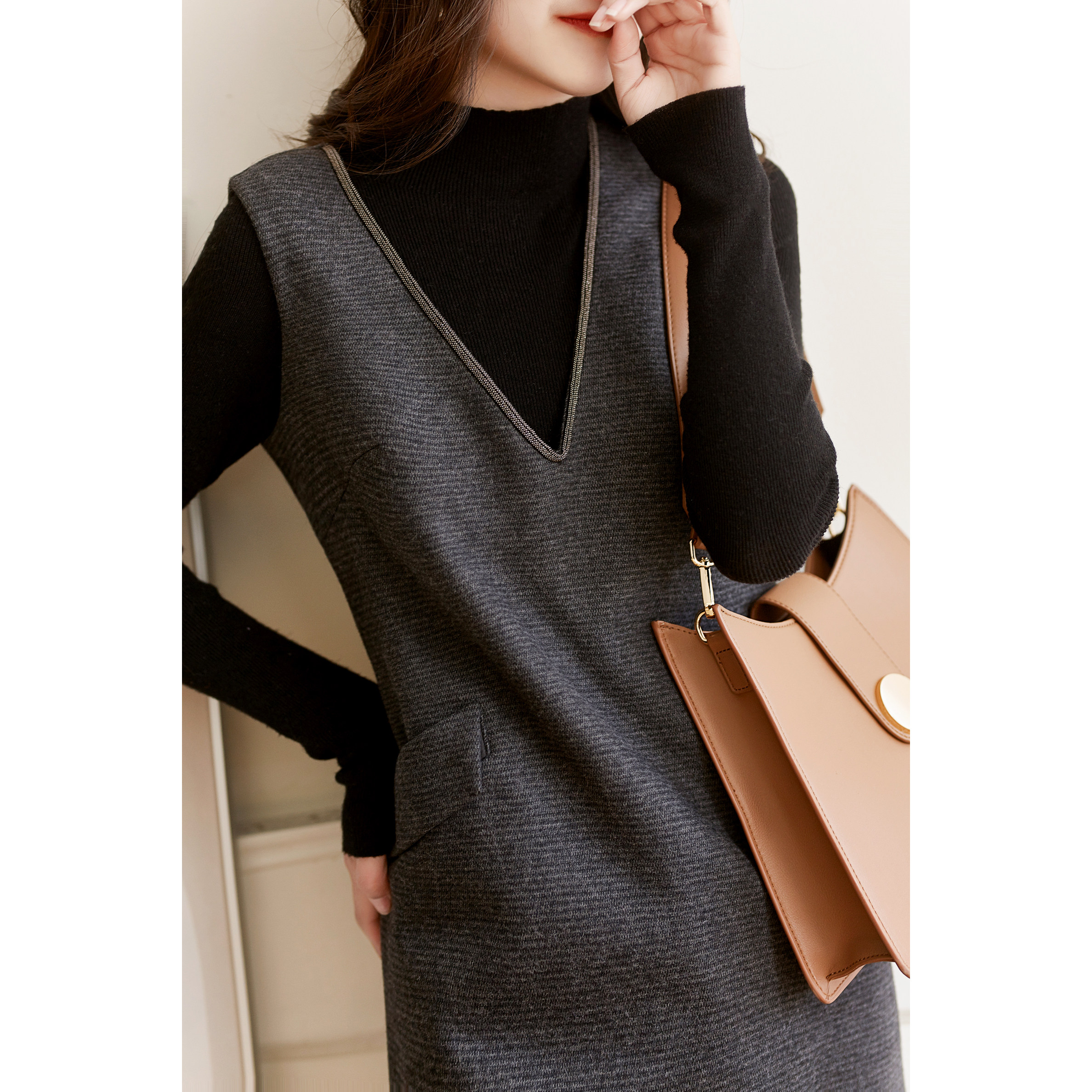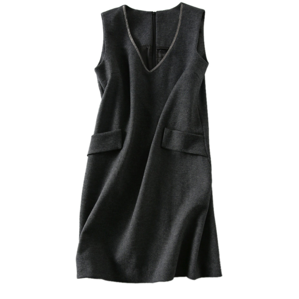 2nd spring and autumn elegant temperament woman rhyme bead chain V collar wool vest dress EGQZ37438