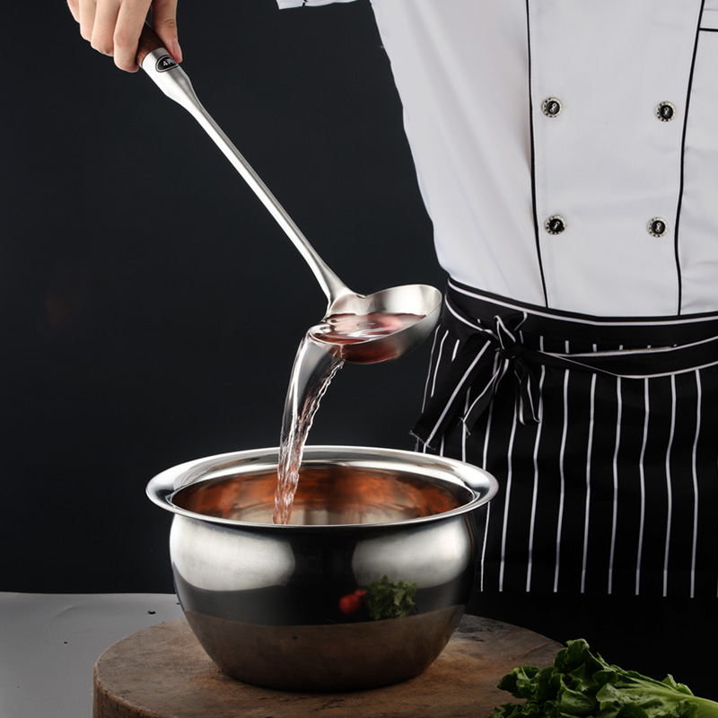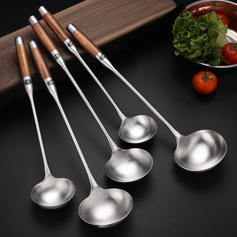 Stainless Steel Saute Spoon Chef Special Hotel Commercial Stir-fry Spoon Large Horn Big Handle Old Fashioned Soup Spoon Wood Handle Divided Vegetable Spoon