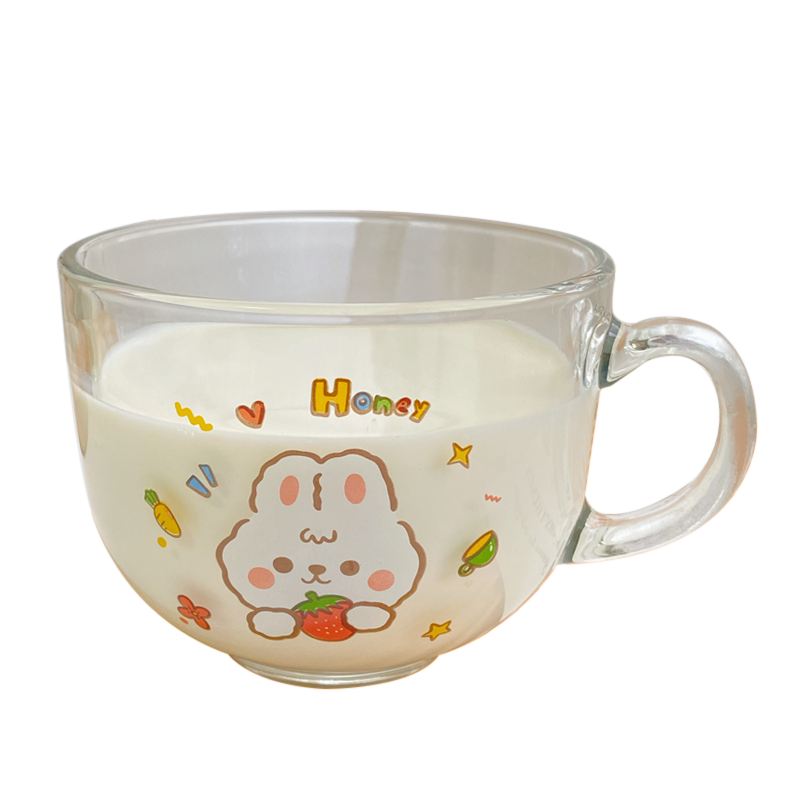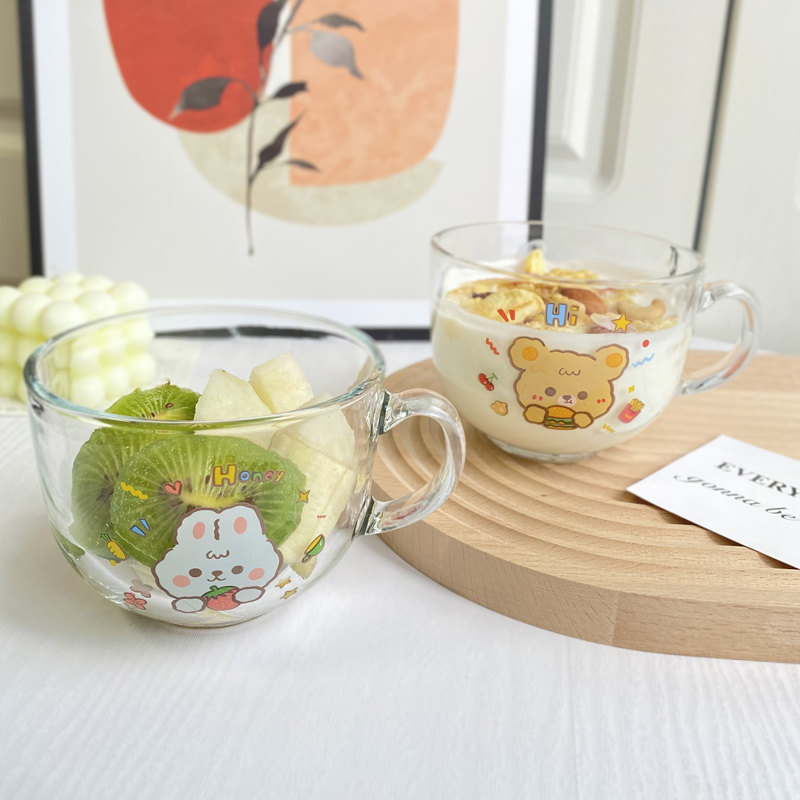 ins wind cute glass cup with lid spoon cartoon heat resistant microwave breakfast milk oat cup female handle mug