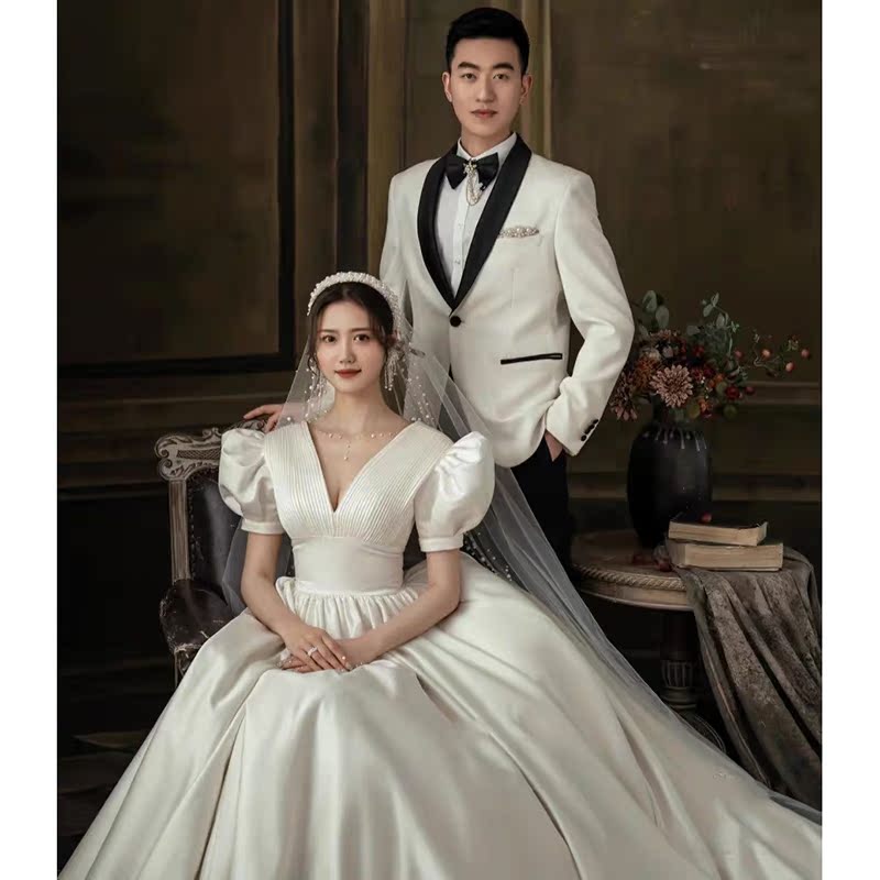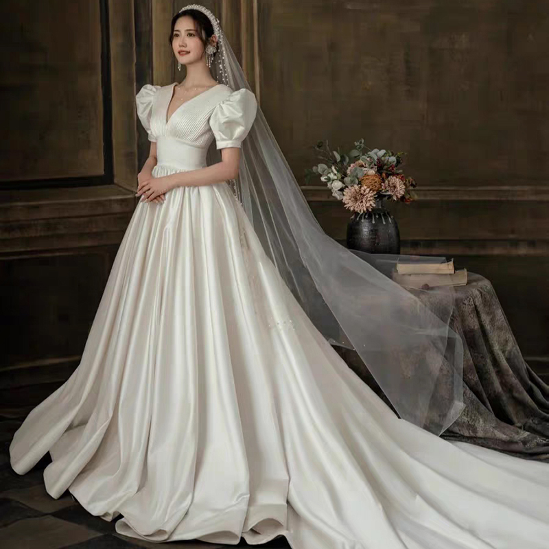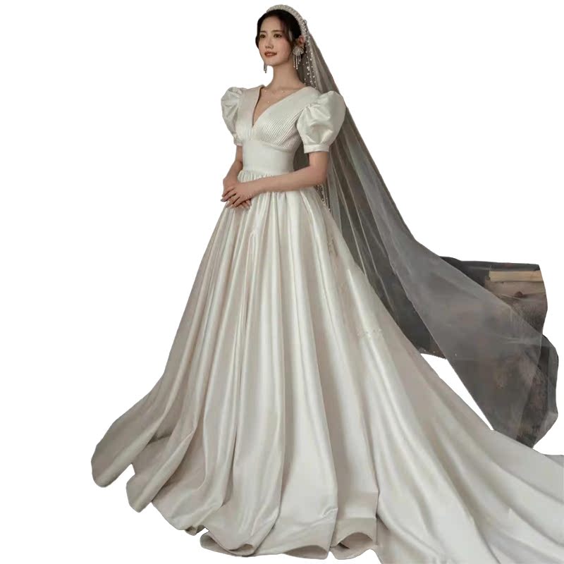 v - collar satin French senior wedding dress 2022 new bride shades the thick arm bubble sleeve drag the end