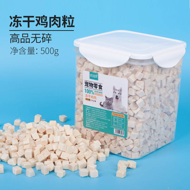 Chicken granules in barrels 500g Duck meat granules in barrels 500g Five kinds of mixed granules 500g in egg yolk granules in barrels 500g in chicken breasts in barrels 100g in duck breasts in barrels 350g in multi-spring fish barrels 3