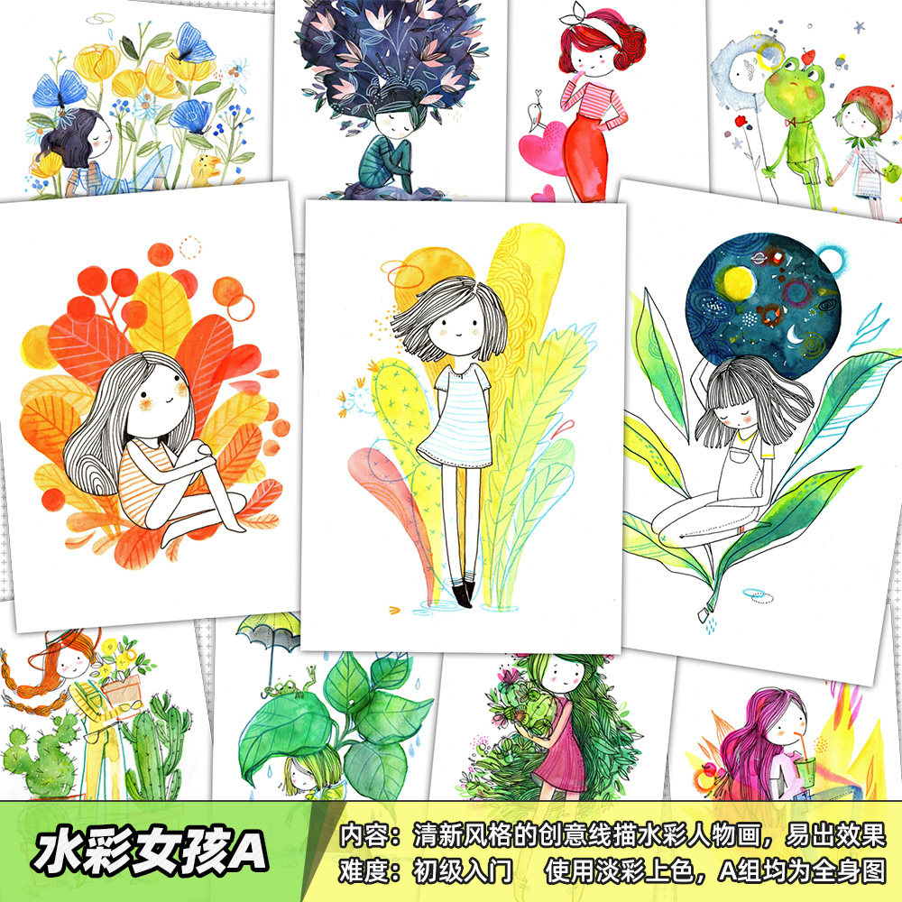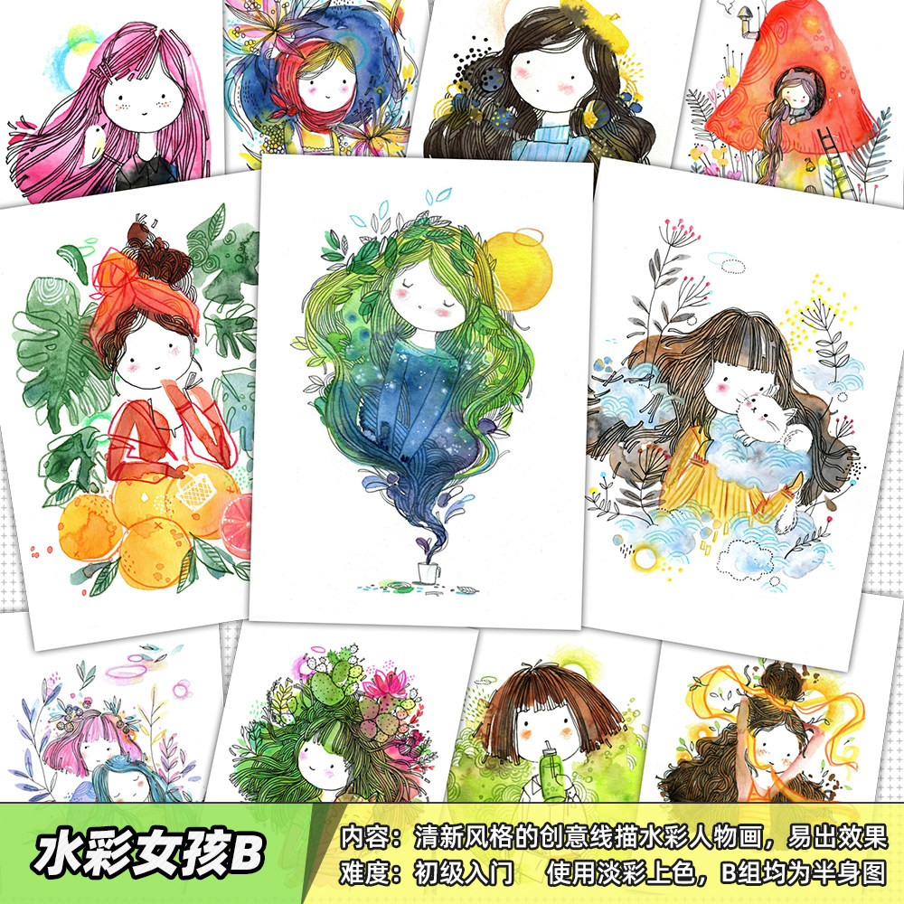 Creative watercolor line sketching characters Imitation Cardless Girls Fan Painting Material Junior Introductory Painting Room Cartoon Card-Taobao