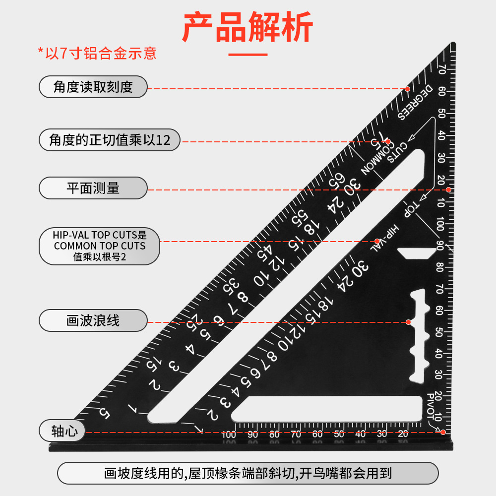 High-precision aluminum alloy triangular plate 7 inch aluminum woodwork horizontal triangle ruler 12 inch with 90-degree angle square