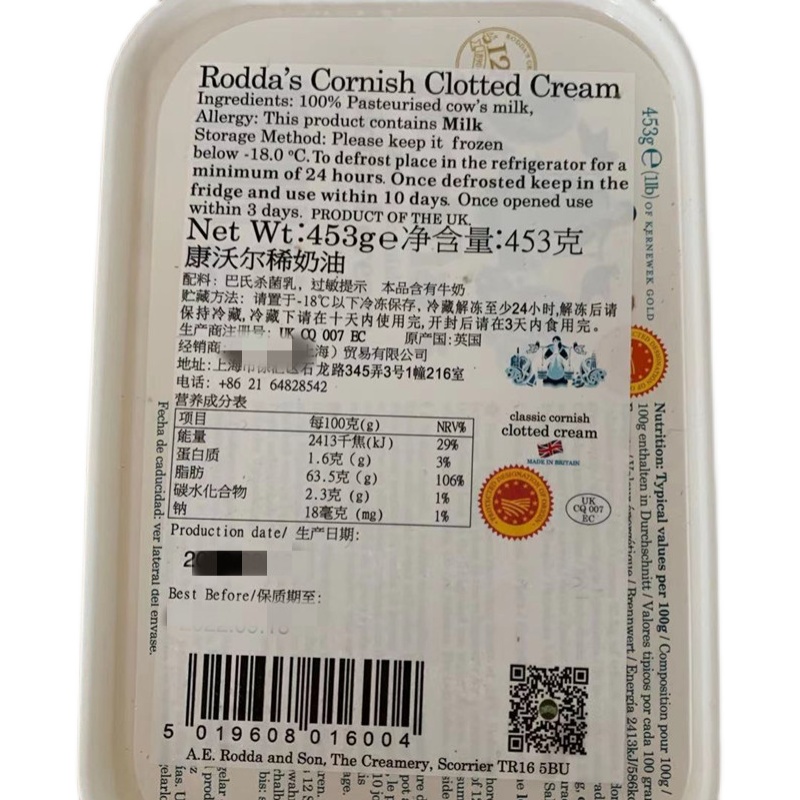 British imports of Cornwall thin cream Roddas Cornish Cloted Cream thick cheese 453 gr