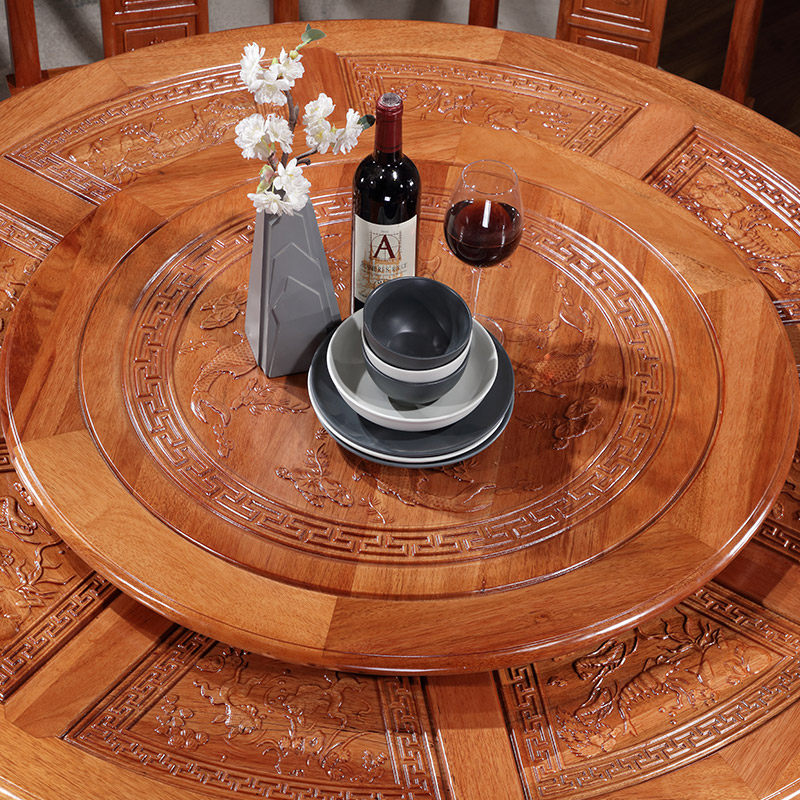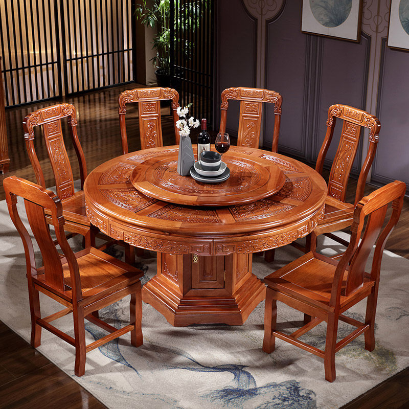 Solid wood dining table and chair combination round dining table with turntable dining table household new Chinese mahogany 10 people large round table