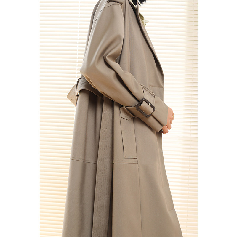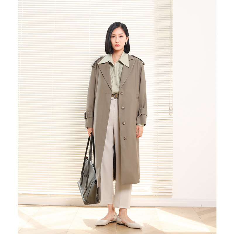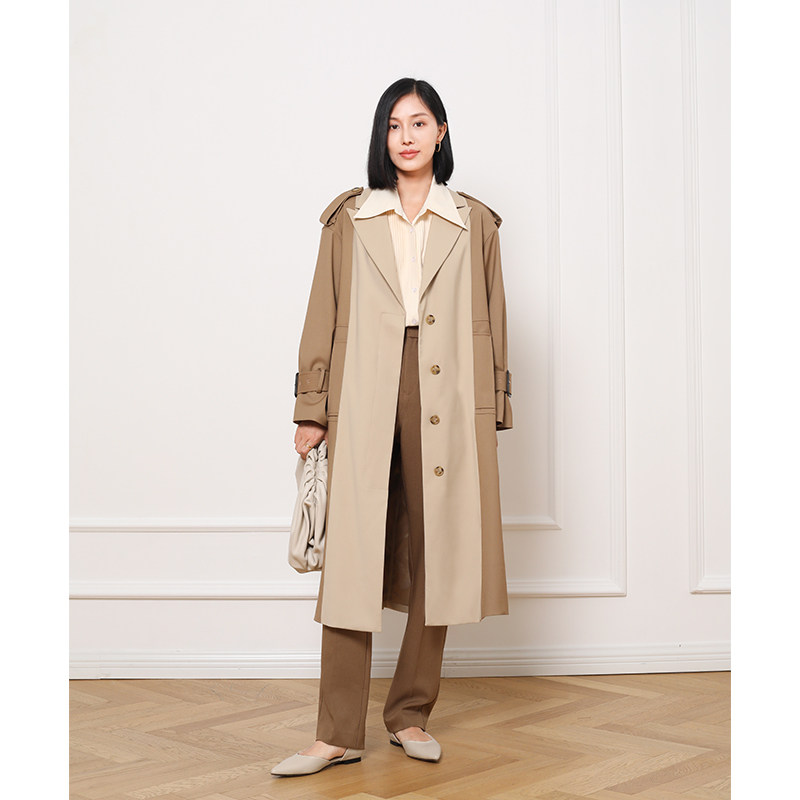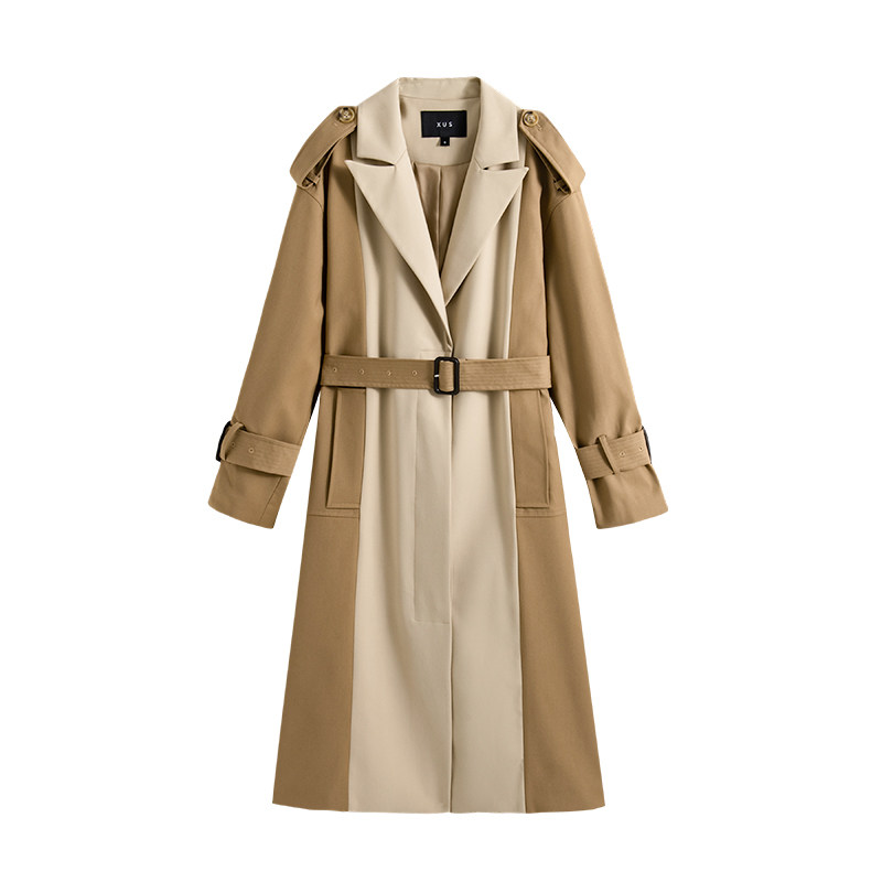 Pumen XUS retro single-breasted high-end windbreaker color contrast splicing tie design mid-length coat for women