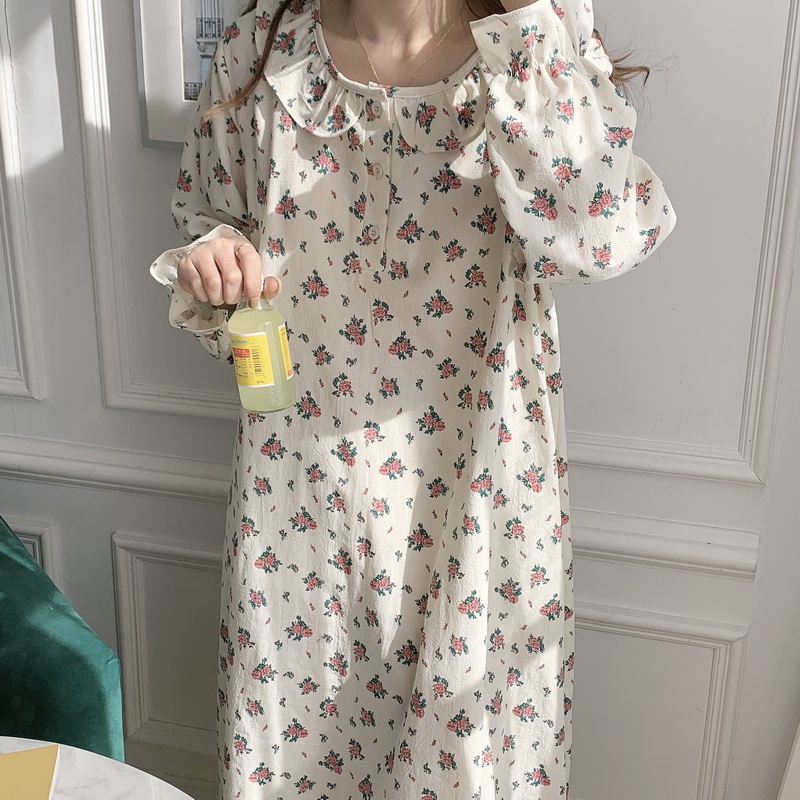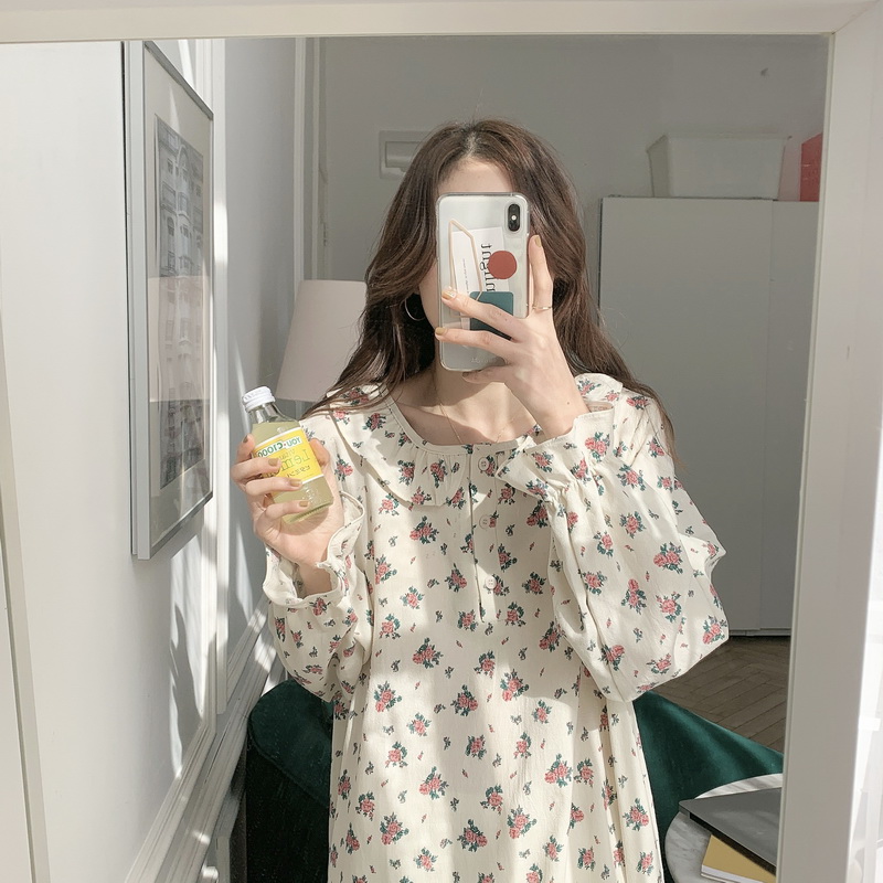 Han edition in ~ a cluster of violet pajamas female spring and autumn pure sleeve crystal red flowers sweet outer sleeping skirt