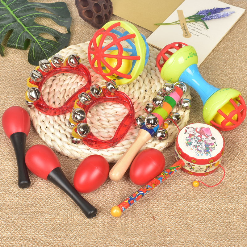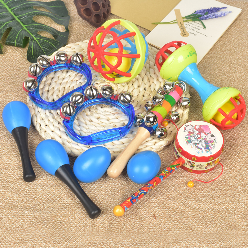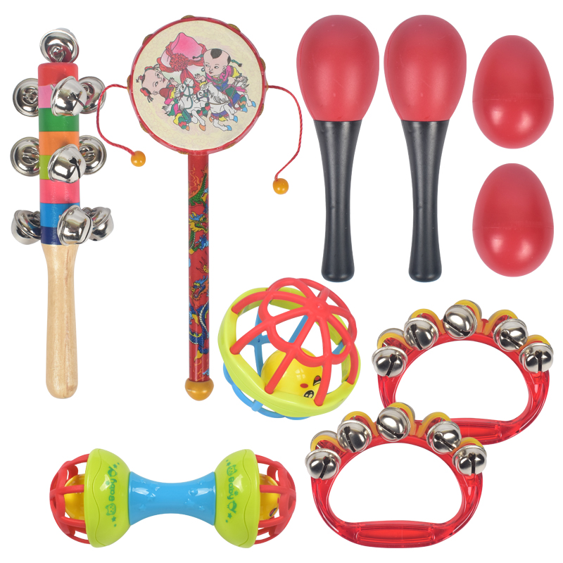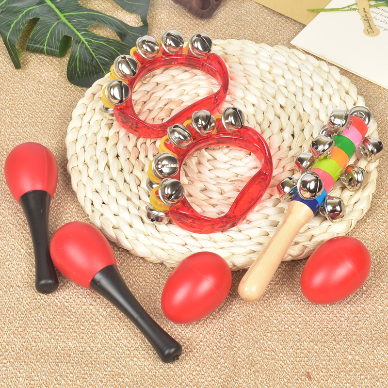 A pair of red sand hammers, a pair of blue sand hammers, a pair of green sand hammers, a pair of yellow sand hammers, a pair of pink sand hammers, a pair of rattles