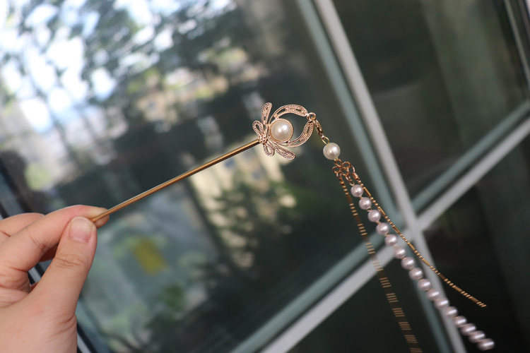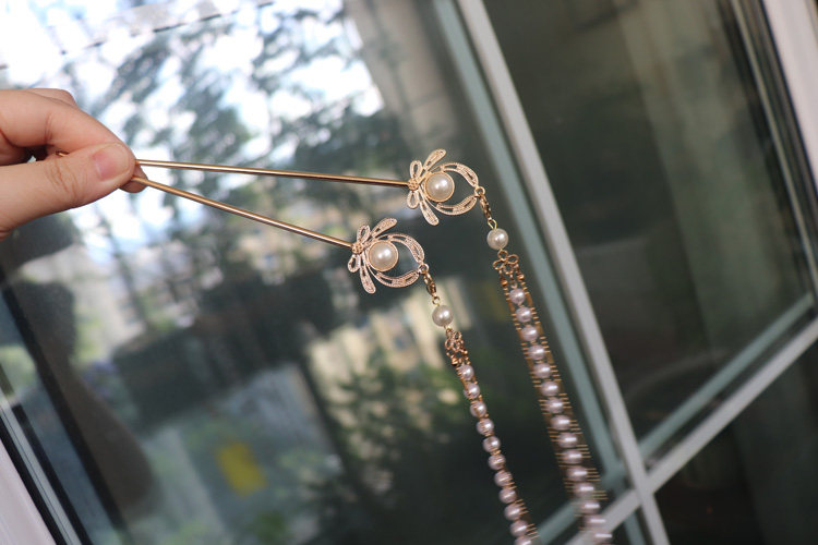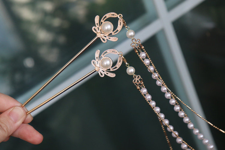 Mengqi original Hanfu hairpin pearl long tassel carved headdress ancient style hairpin step shaking ancient costume Tang style hair accessories