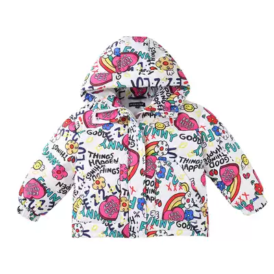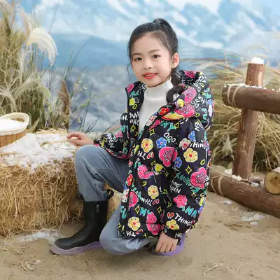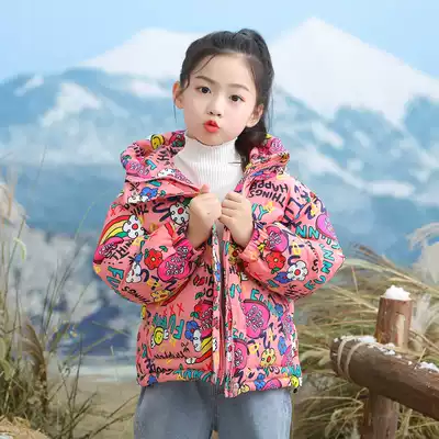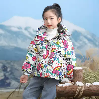 Anti-season graffiti children's down clothes girl thickened Korean winter coat baby big children short hooded foreign pie