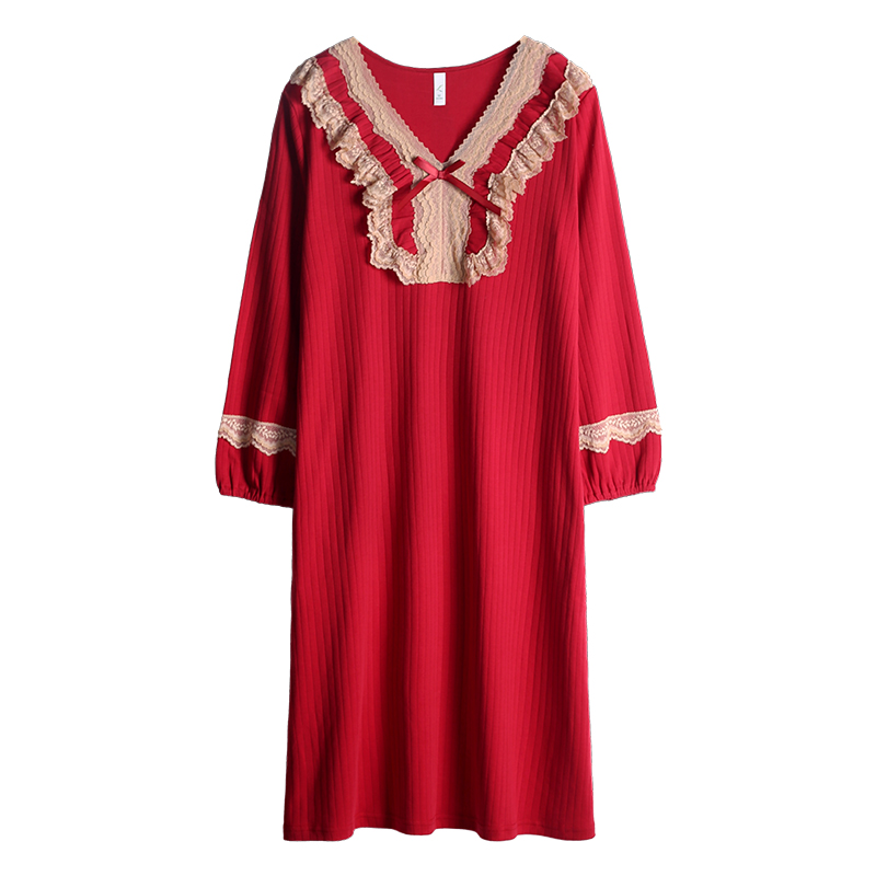Red Sleeping Dress Woman Spring Autumn Season Pure Cotton Long Sleeve Bridal Wedding Lace Pyjamas House Dress Newlyweds Sexy Foreign Dress