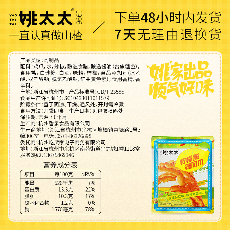 Mrs. Yao lemon hot and sour chicken feet 200g net red snacks ready-to-eat bagged snacks casual chicken feet small snacks