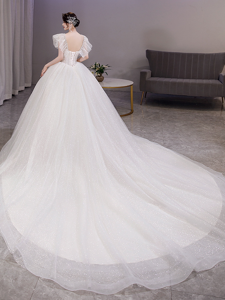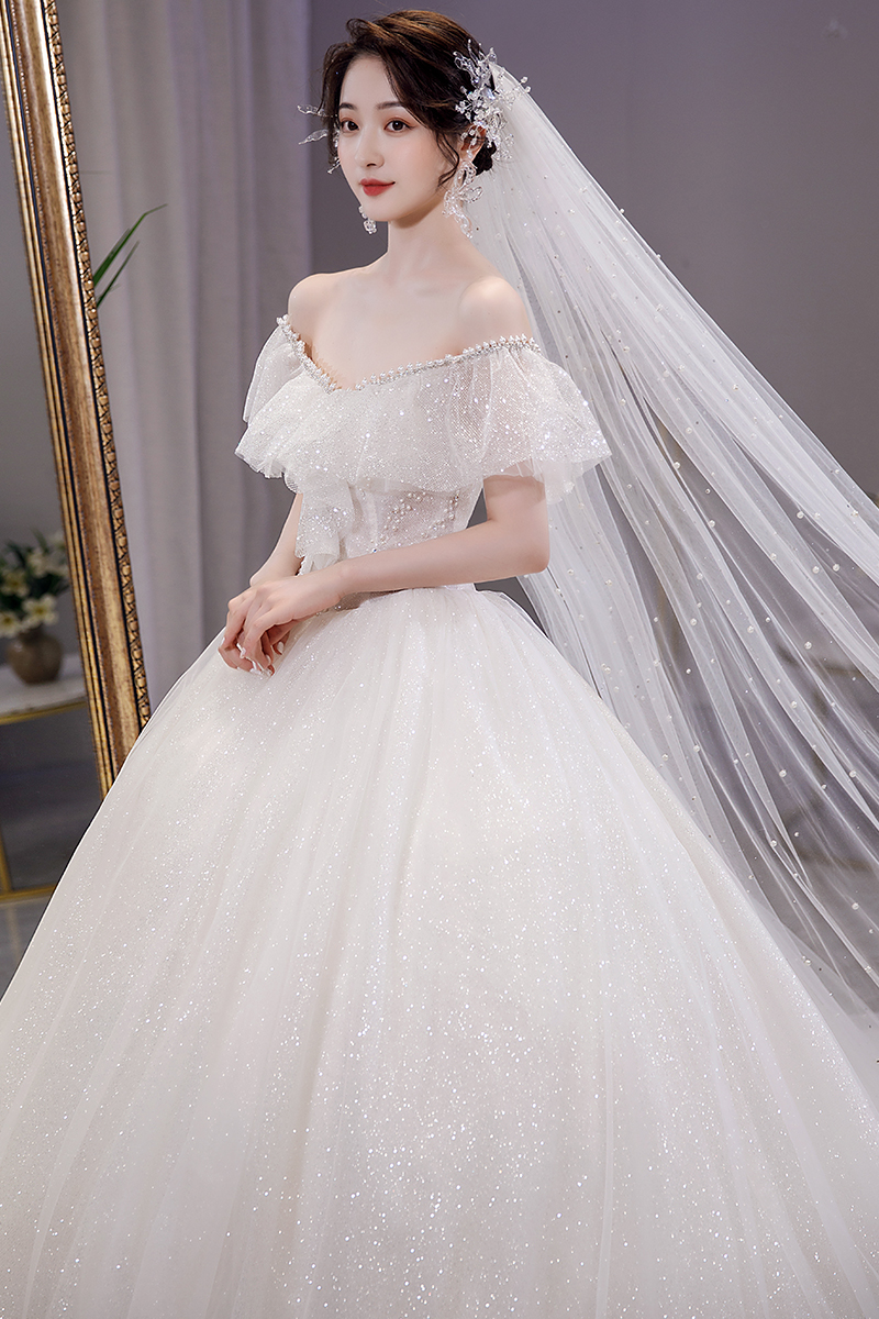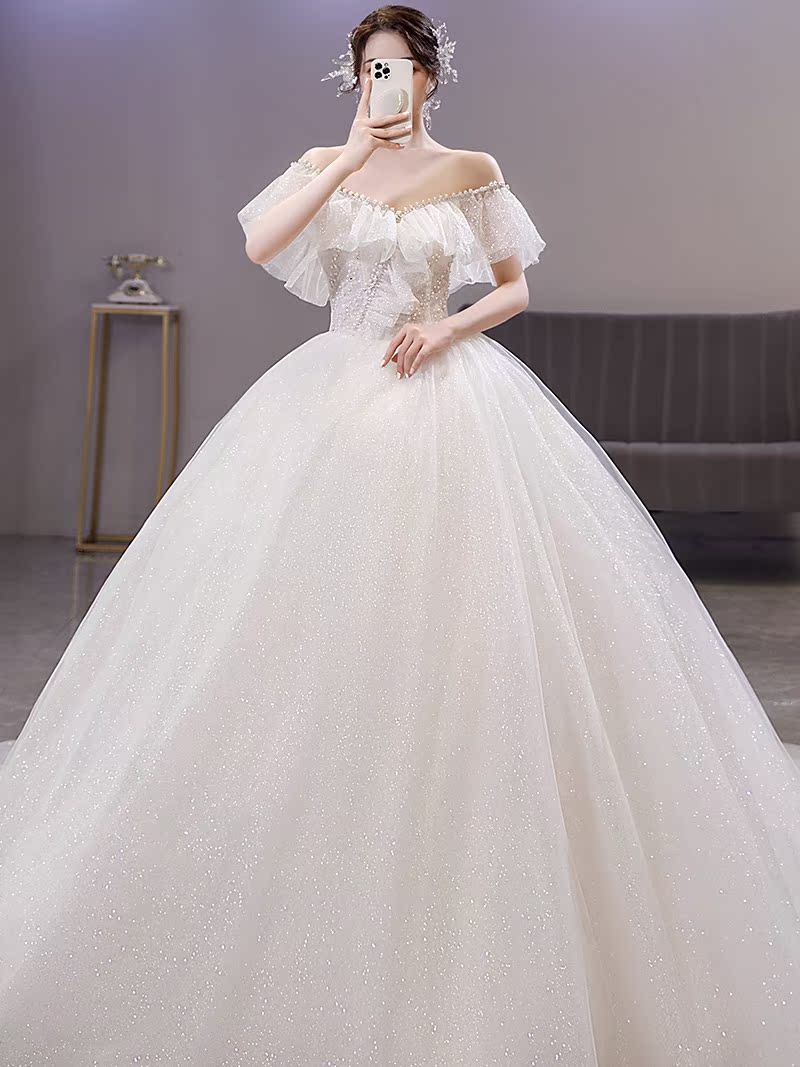One-word shoulder starry sky wedding dress 2021 new bride summer temperament French Palace wind go out gauze big tailing tail 2022