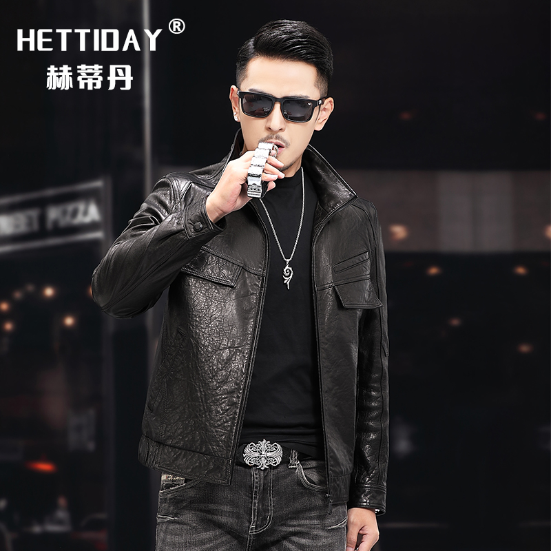 Haining's new high-end leather jacket men's oil wax sheepskin short handsome slim motorcycle leather jacket tide