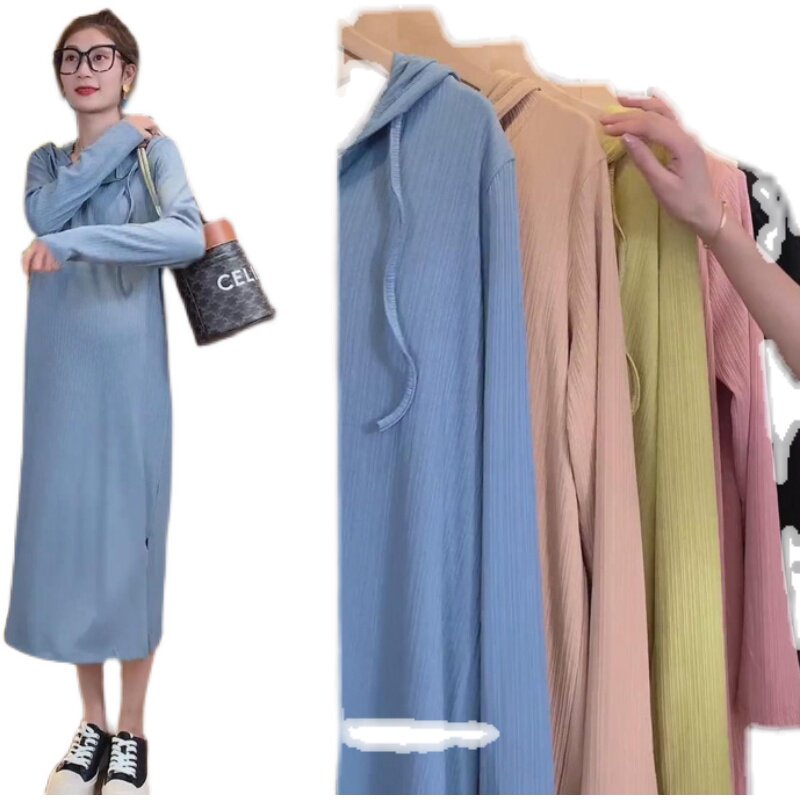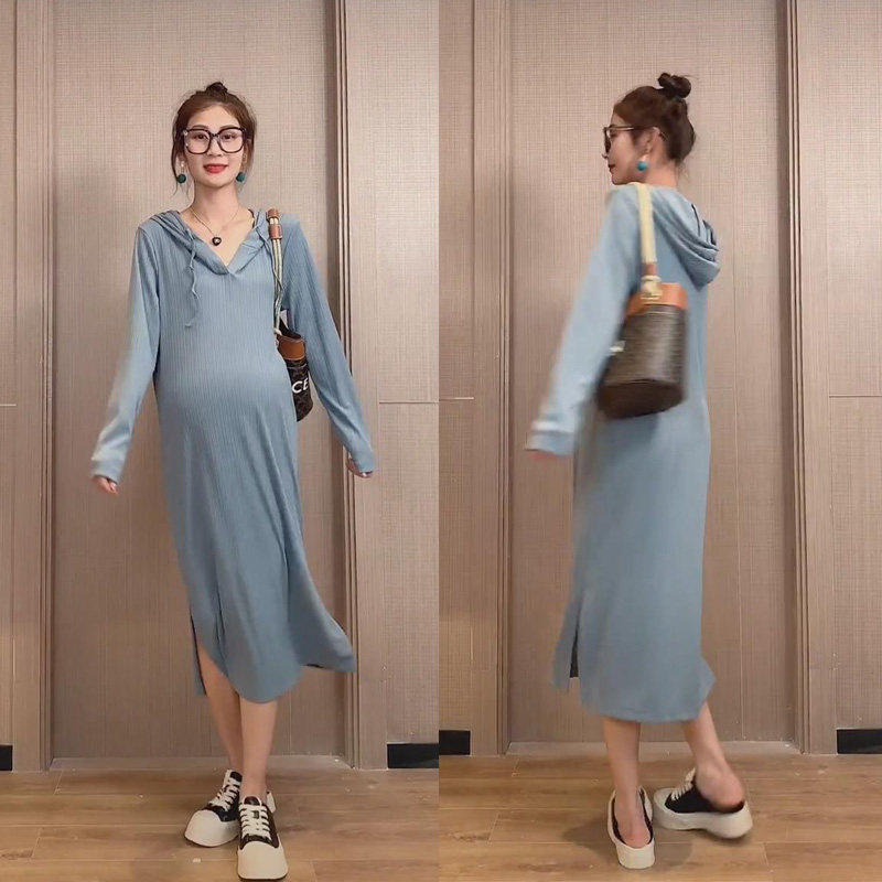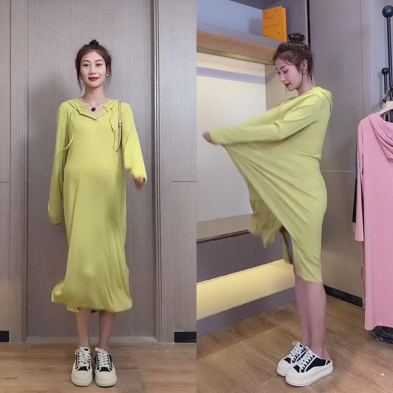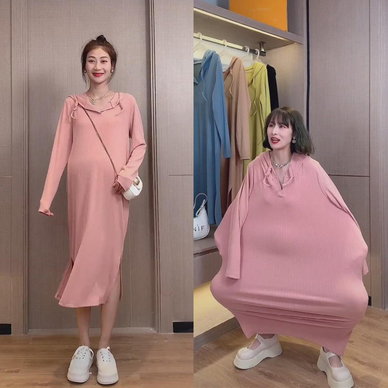 Autumn wear 2021 New pregnant women dress High bullet age reduction sports ice silk knitted net red hooded sweater skirt